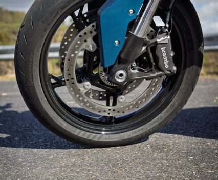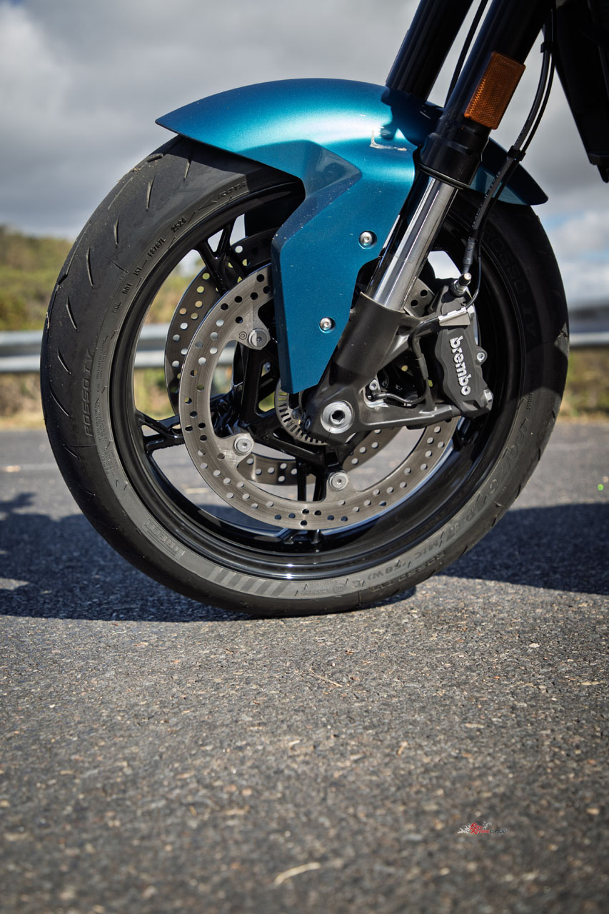 Brakes: 2 x 320mm rotors, four-piston Brembo calipers, ABS Pro (f), single 265mm rotor, single-piston caliper (r)