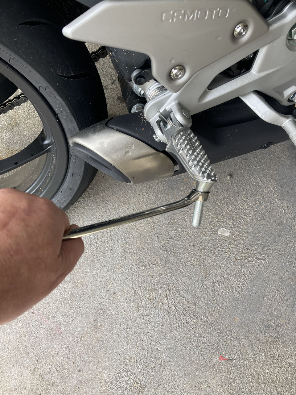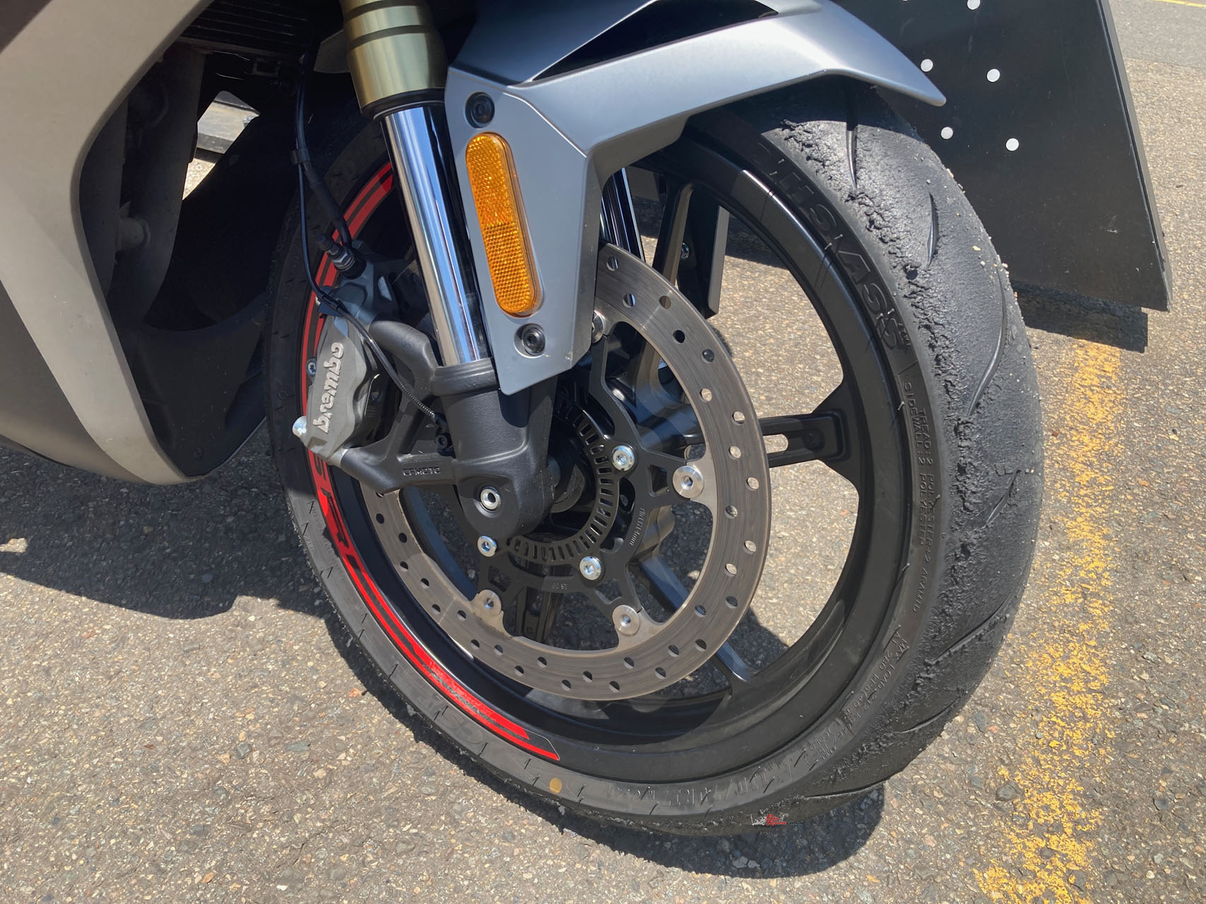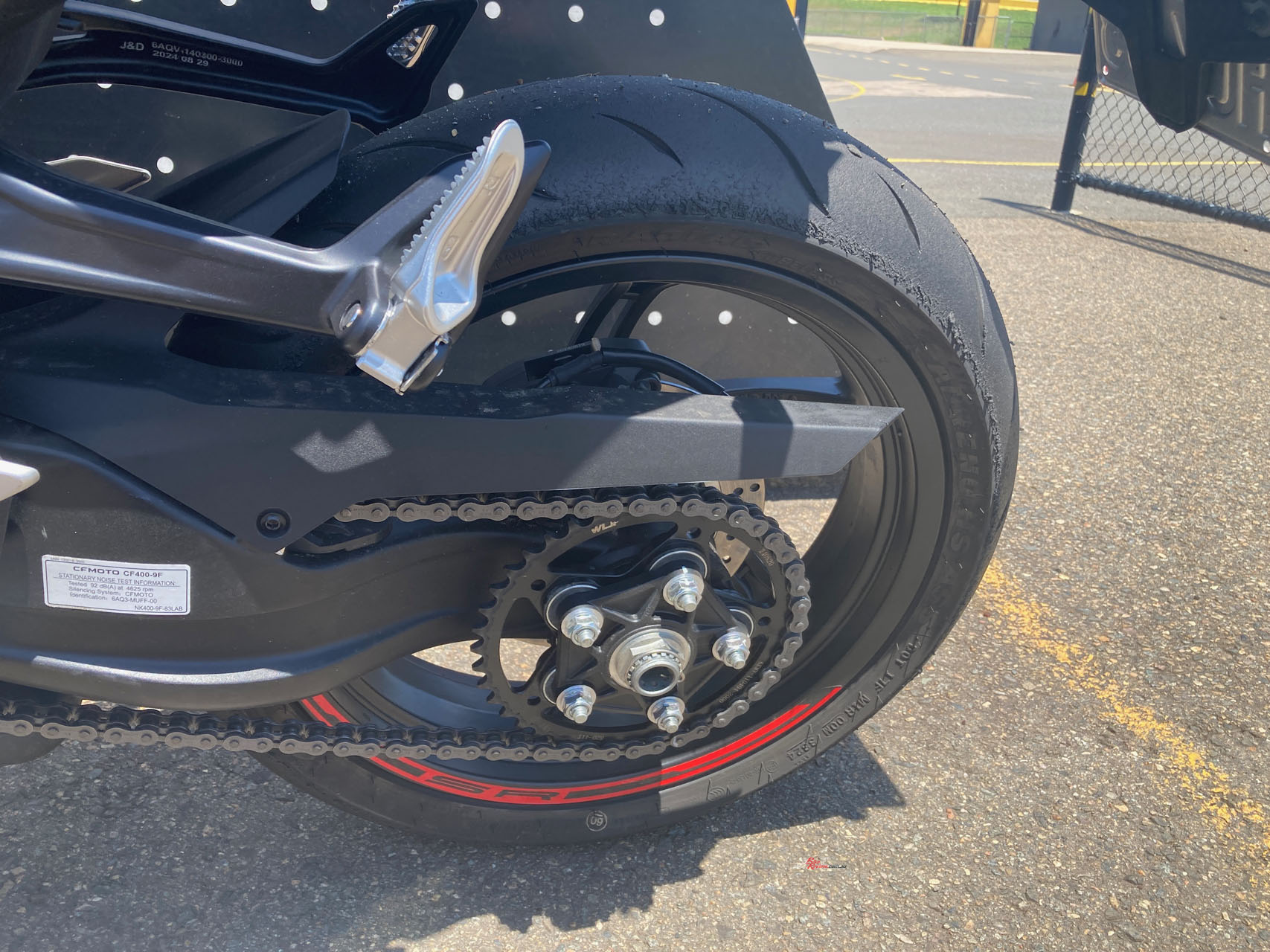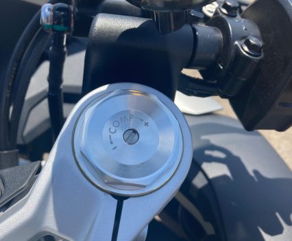 The front does dive excessively under heavy braking, which tends to upset the chassis slightly as you trail brake and release mid-corner, but I’m probably double the weight of a normal CFMOTO 450SR S rider. A fork spring upgrade, or thicker fork oil, would go a long way in improving that if you plan on regular track days and are on the, err, heavier side. Other than that, leave it alone.