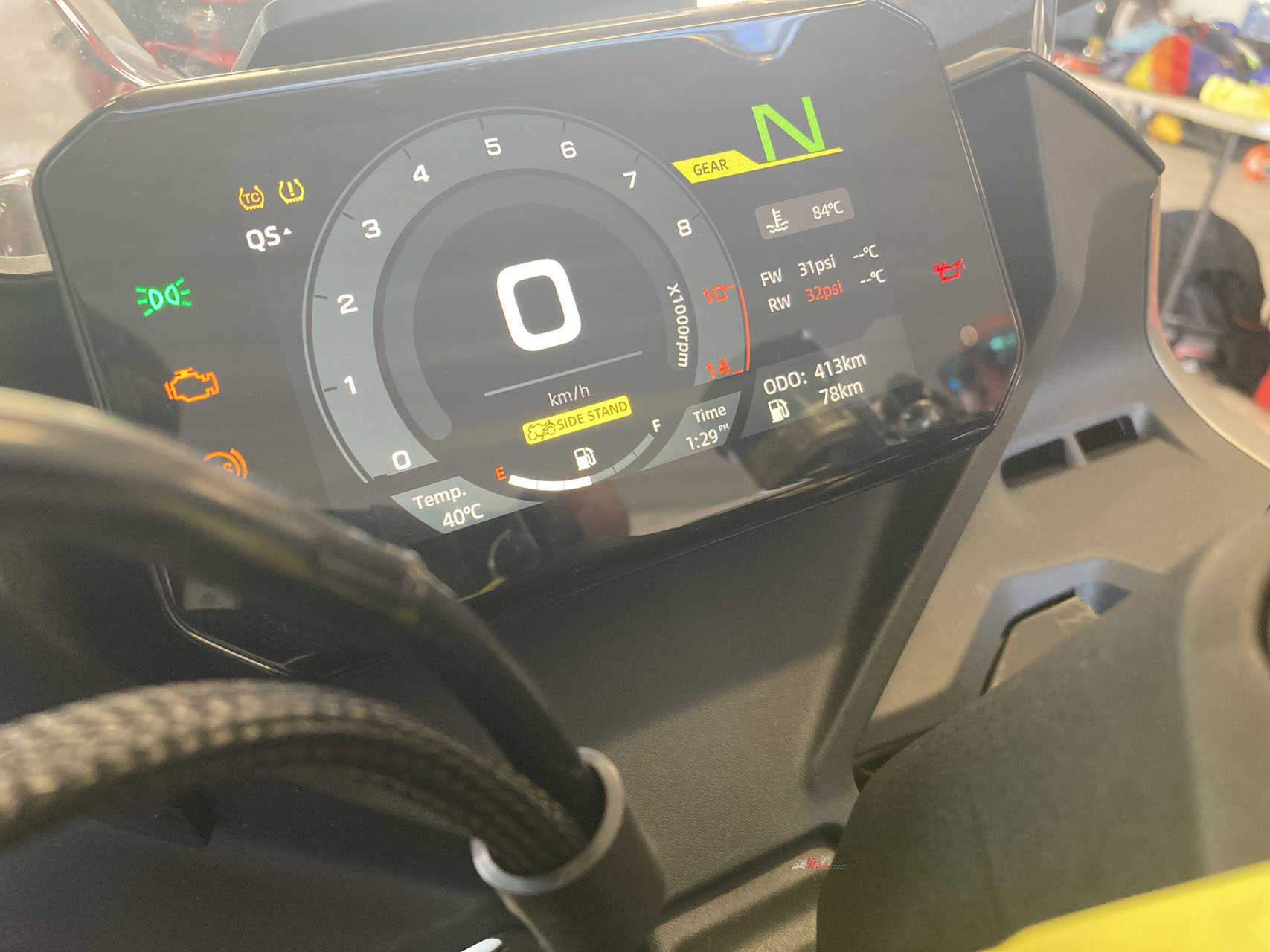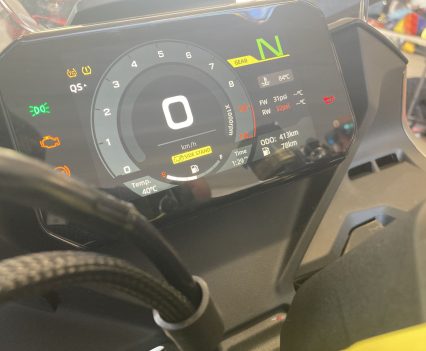 The styling to me is a head-turner. That single-sided swingarm and the MotoGP-inspired winglets make it look far more premium than its price suggests. The full-colour TFT dash is bright and easy to read, and bar-mounted controls give you access to phone connectivity, traction control, and a quickshifter—features rarely seen at this price point, I had a muck around with it all in the pits, it is great.
