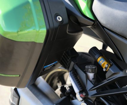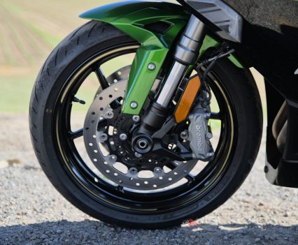 The SE model brings a major step up in componentry. At the rear sits an Öhlins S46 shock, plush yet supportive, paired with quality front forks that give the bike superb control across a mix of surfaces. Stability is excellent, whether flicking through bends or blasting down a motorway. The ride is sporty but forgiving, soaking up the imperfections that make life difficult on stiffer supersport machines. Brembo M4.32 calipers, steel-braided lines, and a Brembo master-cylinder provide sharp, consistent braking performance. The feel at the lever is confidence-inspiring, and combined with cornering ABS and Kawasaki’s electronic safety net, it’s a braking package worthy of a premium tourer.