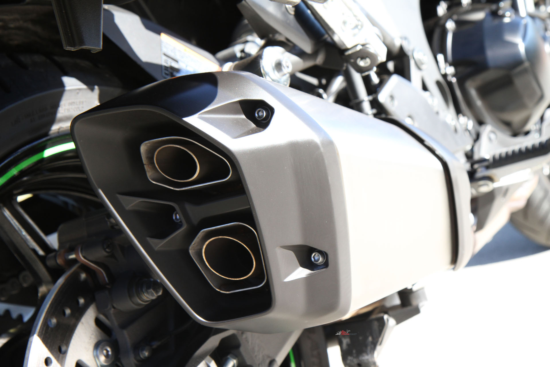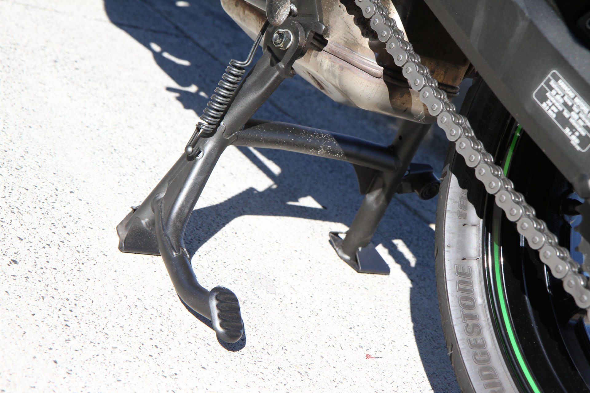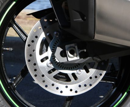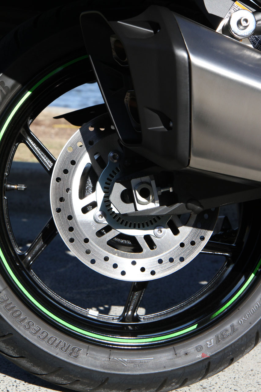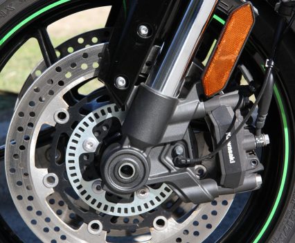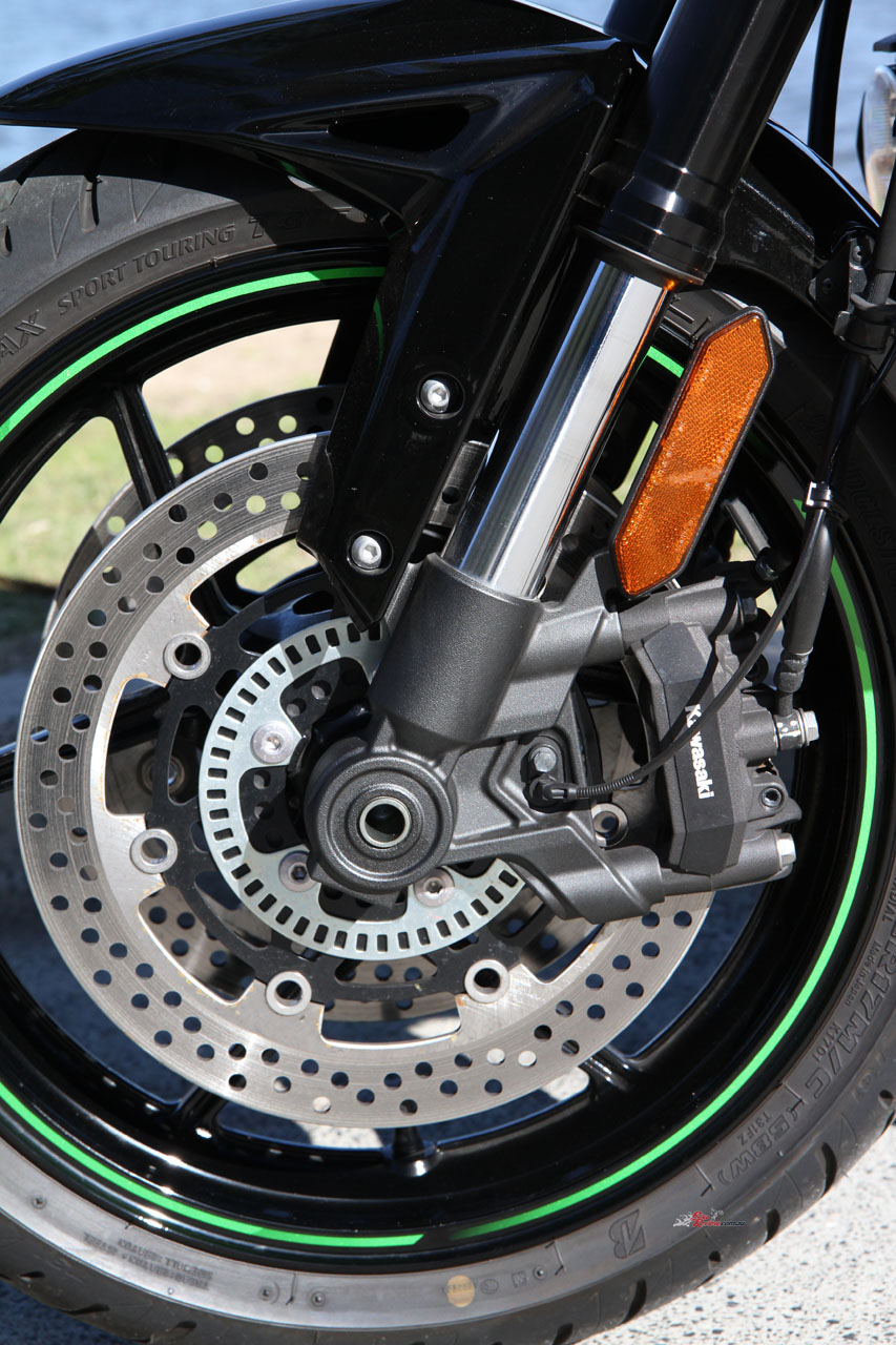 Brakes: Kawasaki Intelligent anti-lock Brake System (KIBS Cornering ABS), dual 310mm front petal discs, four-piston radial-mount monobloc calipers, radial master-cylinder, 250mm rear petal rotor, single-piston caliper