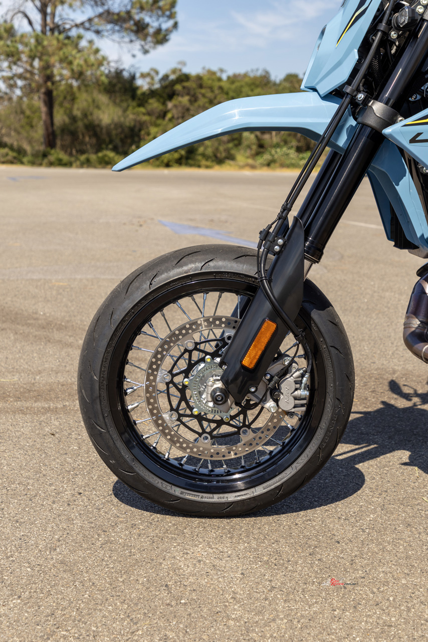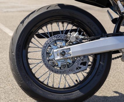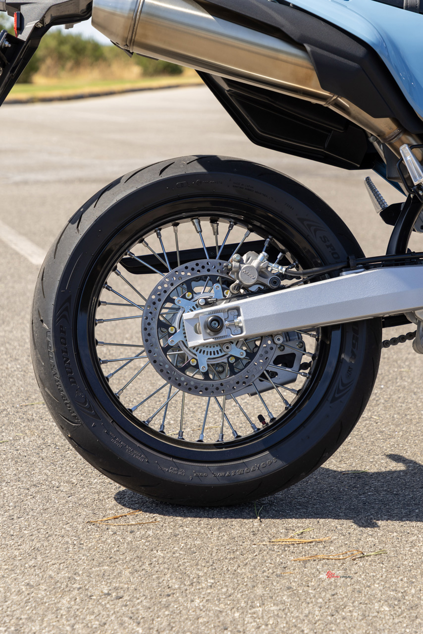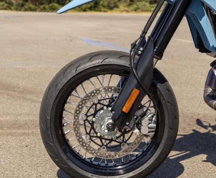 The DR-Z4SM runs Dunlop Sportmax Q5A rubber in 120/70R-17 front and 140/70R-17 rear sizing, and it suits the bike’s road-focused intent straight away, giving it a confident, planted feel. The SM rolls on spoked 17-inch wheels, so it’s running tubes rather than going tubeless, but in exchange you get that classic supermoto combination of quick steering, heaps of feel and quality rubber.