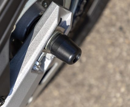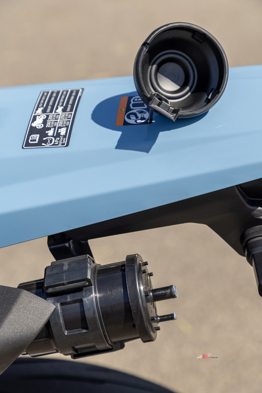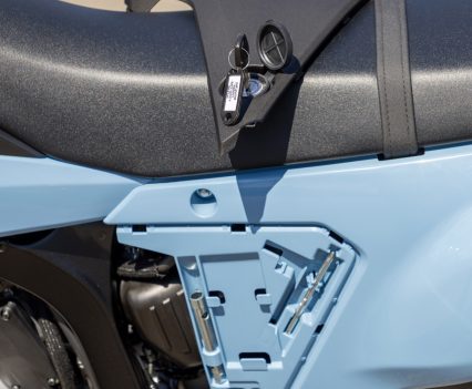 There’s a basic tool kit tucked behind a removable left-side cover. A rubber flap hides the keyhole, and using the ignition key gets you access to a spark plug tool, plus Phillips and flat head screwdriver bits. There’s a space for something rectangular-shaped, but I can’t think what may be missing – answers in the comments section if you work it out, please!