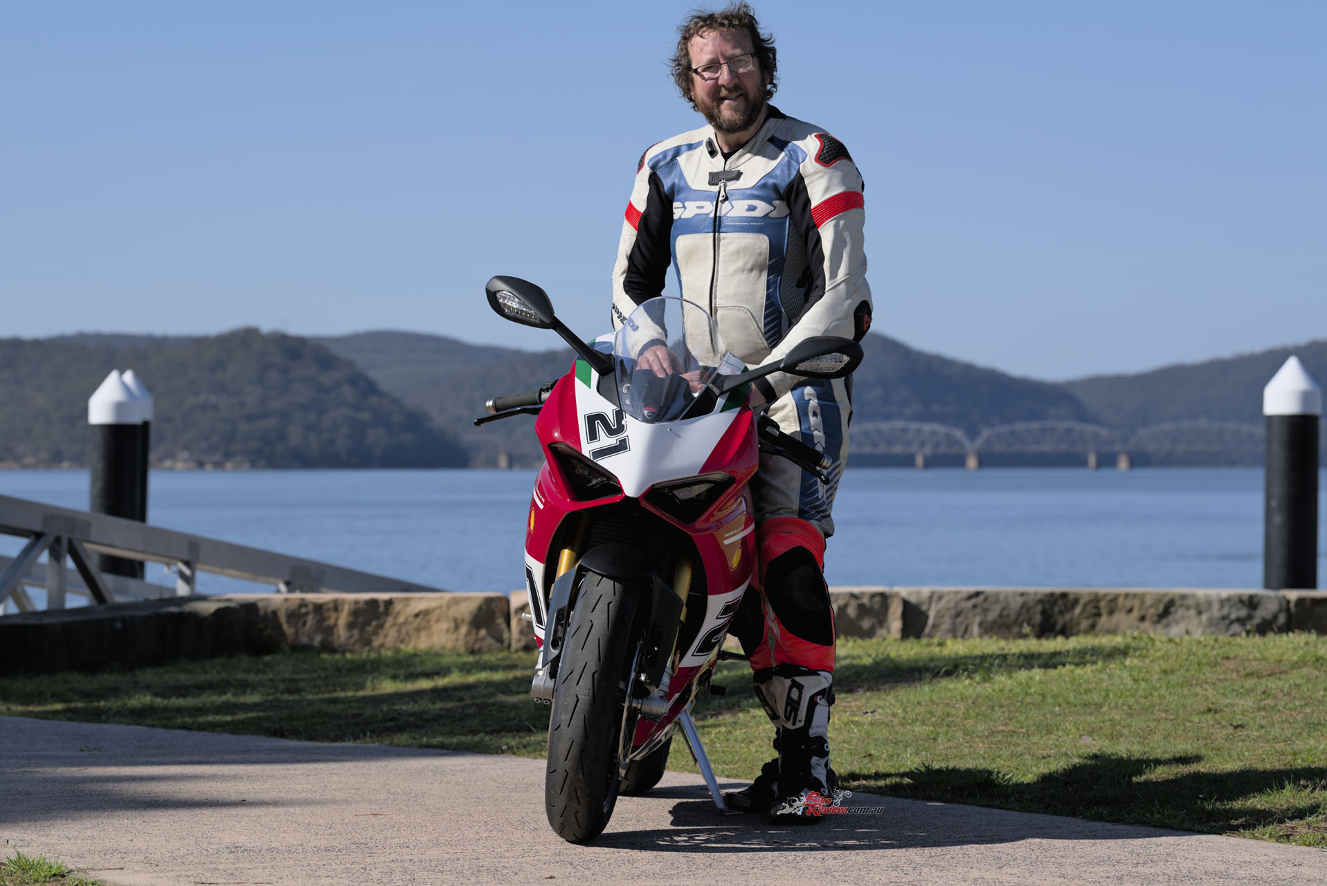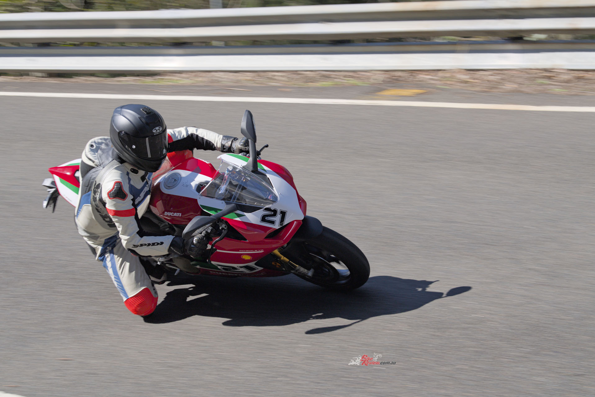 The special edition with #21 stitched in seat is comfortable enough for a few hours, the ‘bar position gives you control without folding you in half, and the narrow tank makes it easy to move around during cornering. At 187cm, I felt right at home. And the heat is not as bad as the V4, you will be glad to hear, but it still gets warm of course, but it’s not built for touring!