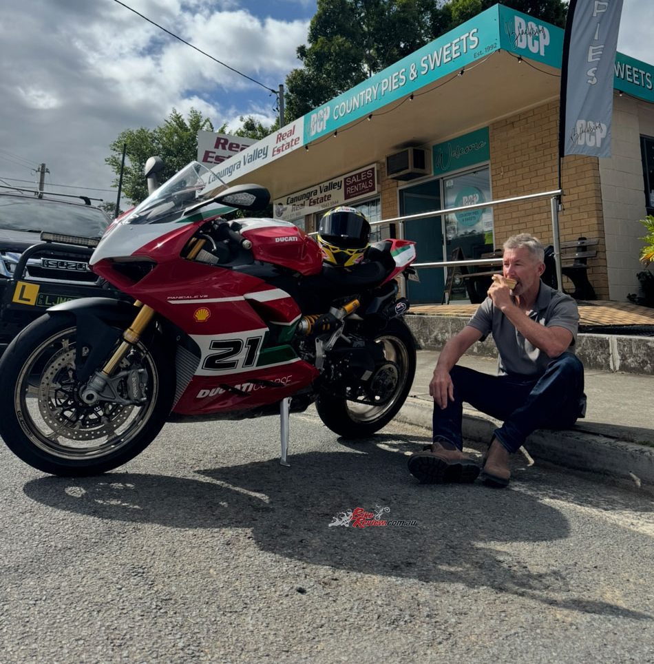 Troy Bayliss has a bunch of extras fitted to his own one, which is number #21 of course. Here he is enjoying an Aussie meat pie out on a ride on his bike… Pic: Bayliss archives.