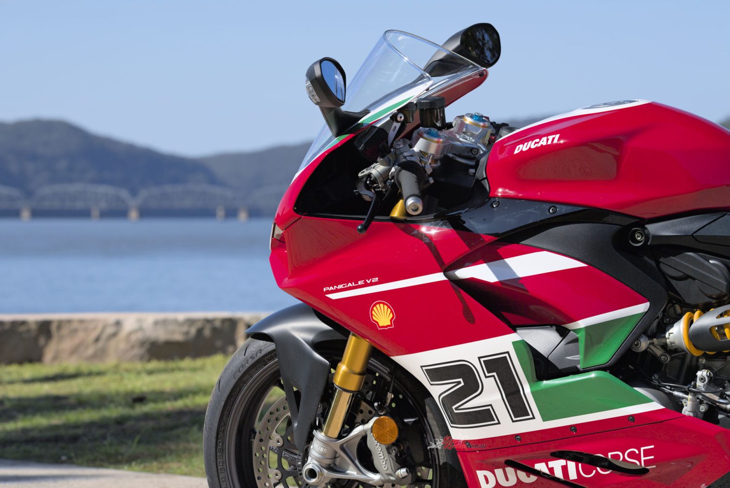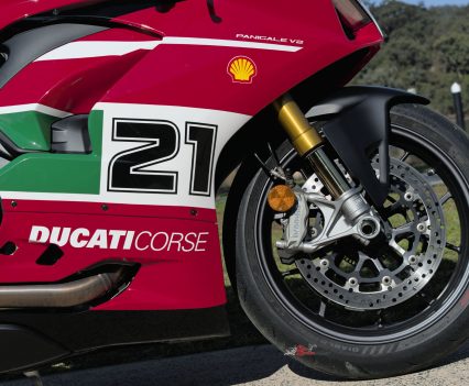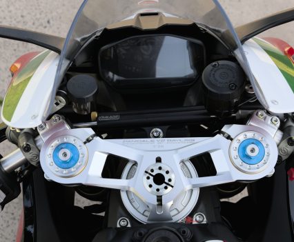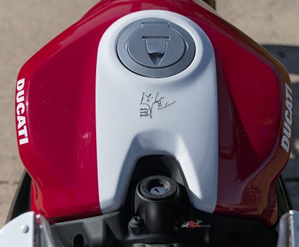It’s the details that set the Bayliss edition apart: the billet alloy triple-clamp engraved with an edition number (our test bike was #3144), Troy’s signature on the tank, the famous number #21 on the fairing, and a livery that faithfully mirrors the 996 R he rode to his first World Superbike crown in 2001. The finish is flawless, with rich red, clean white, and subtle green accents that pop in the sunlight.
