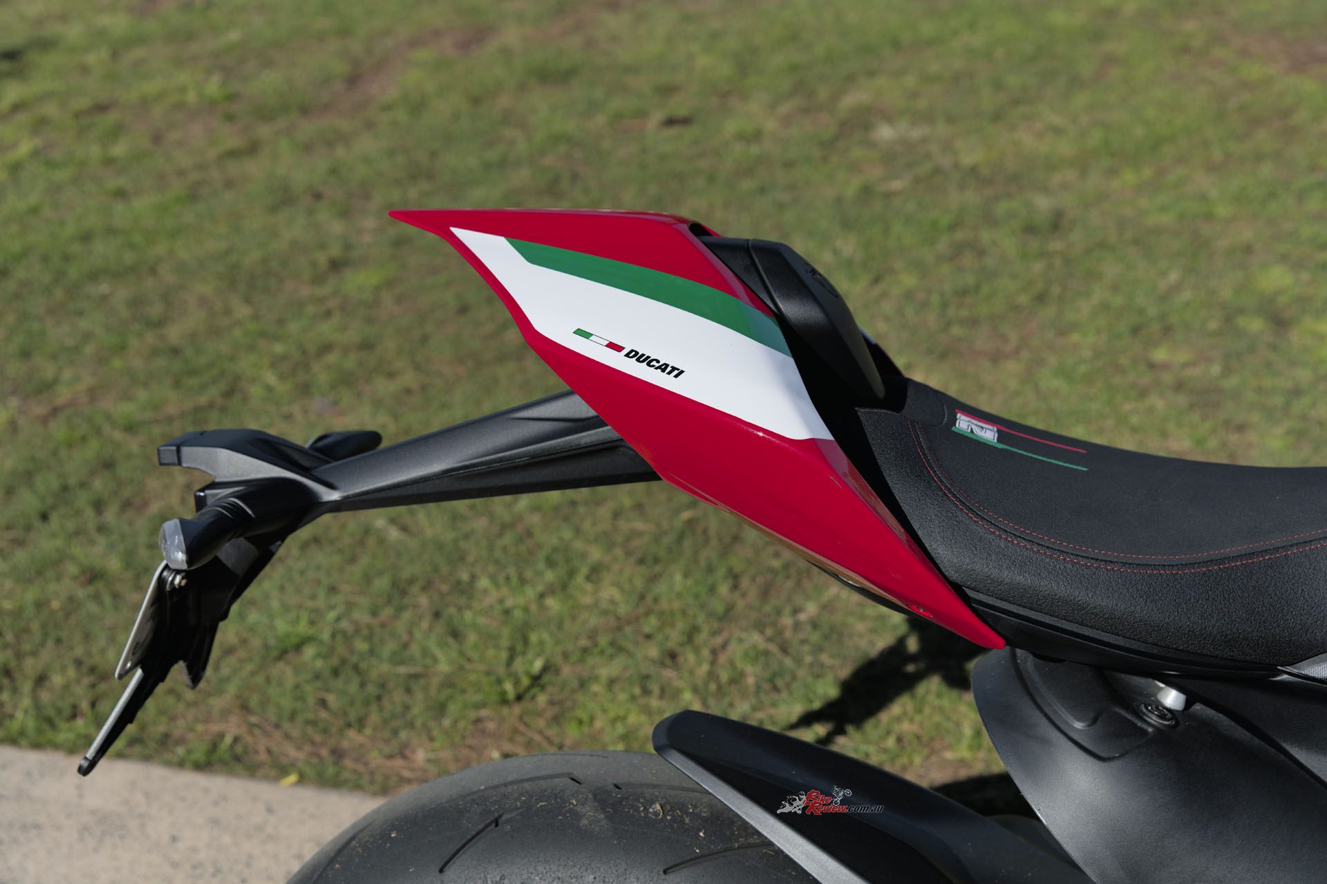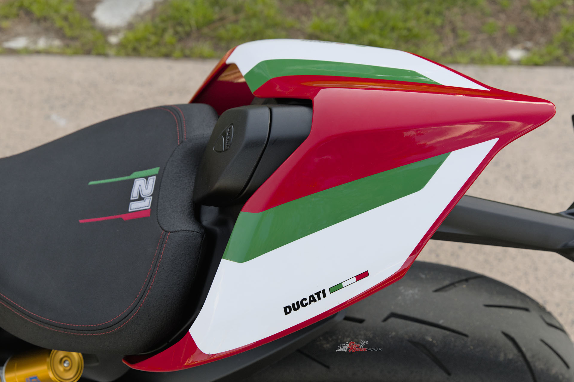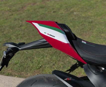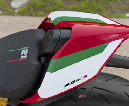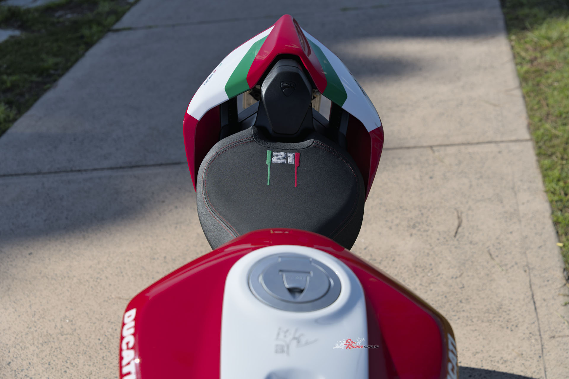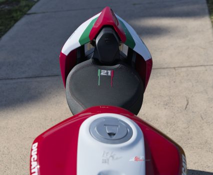 The special edition with #21 stitched in seat is comfortable enough for a few hours, the ‘bar position gives you control without folding you in half, and the narrow tank makes it easy to move around during cornering. At 187cm, I felt right at home. And the heat is not as bad as the V4, you will be glad to hear, but it still gets warm of course, but it’s not built for touring!