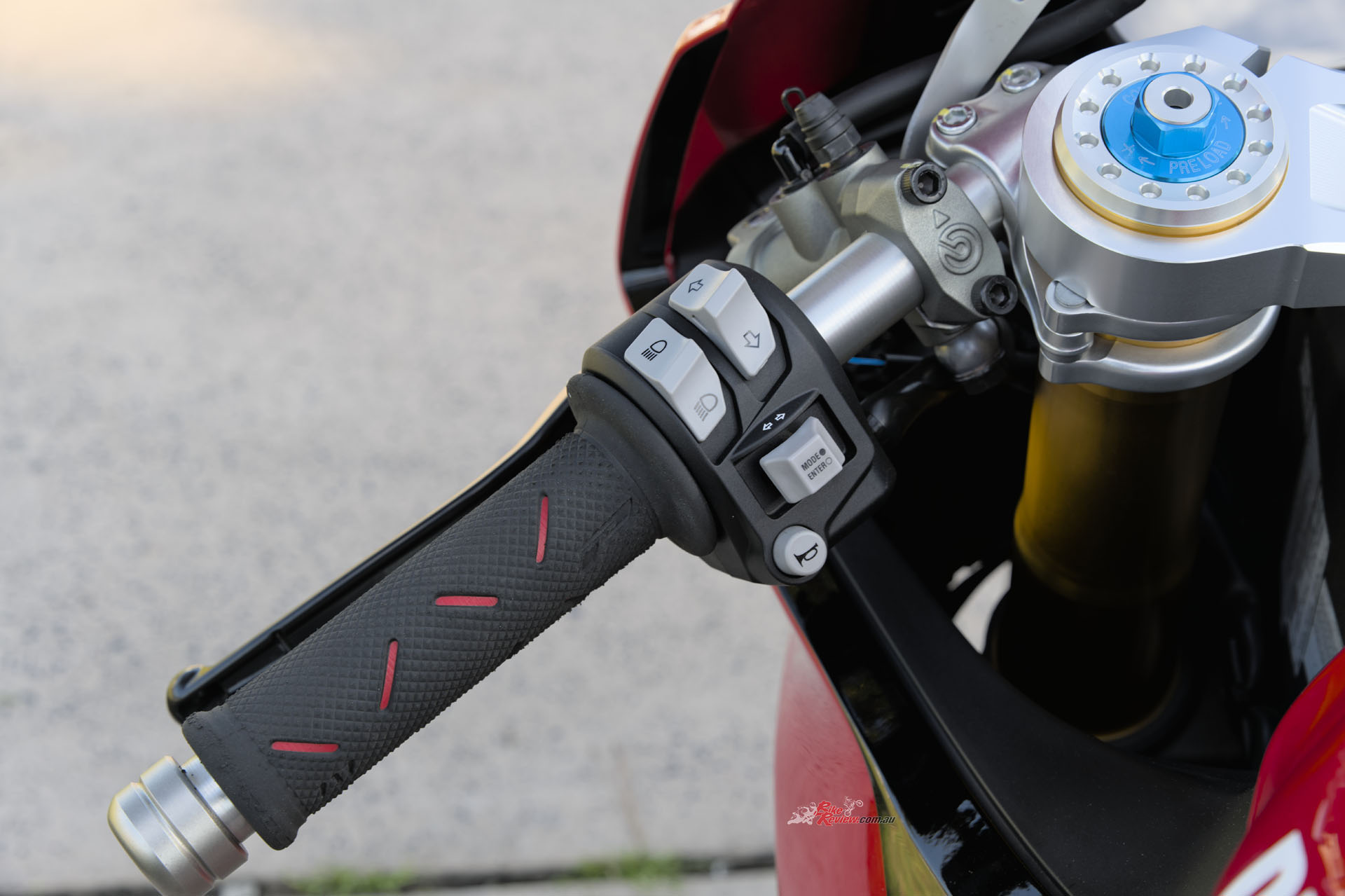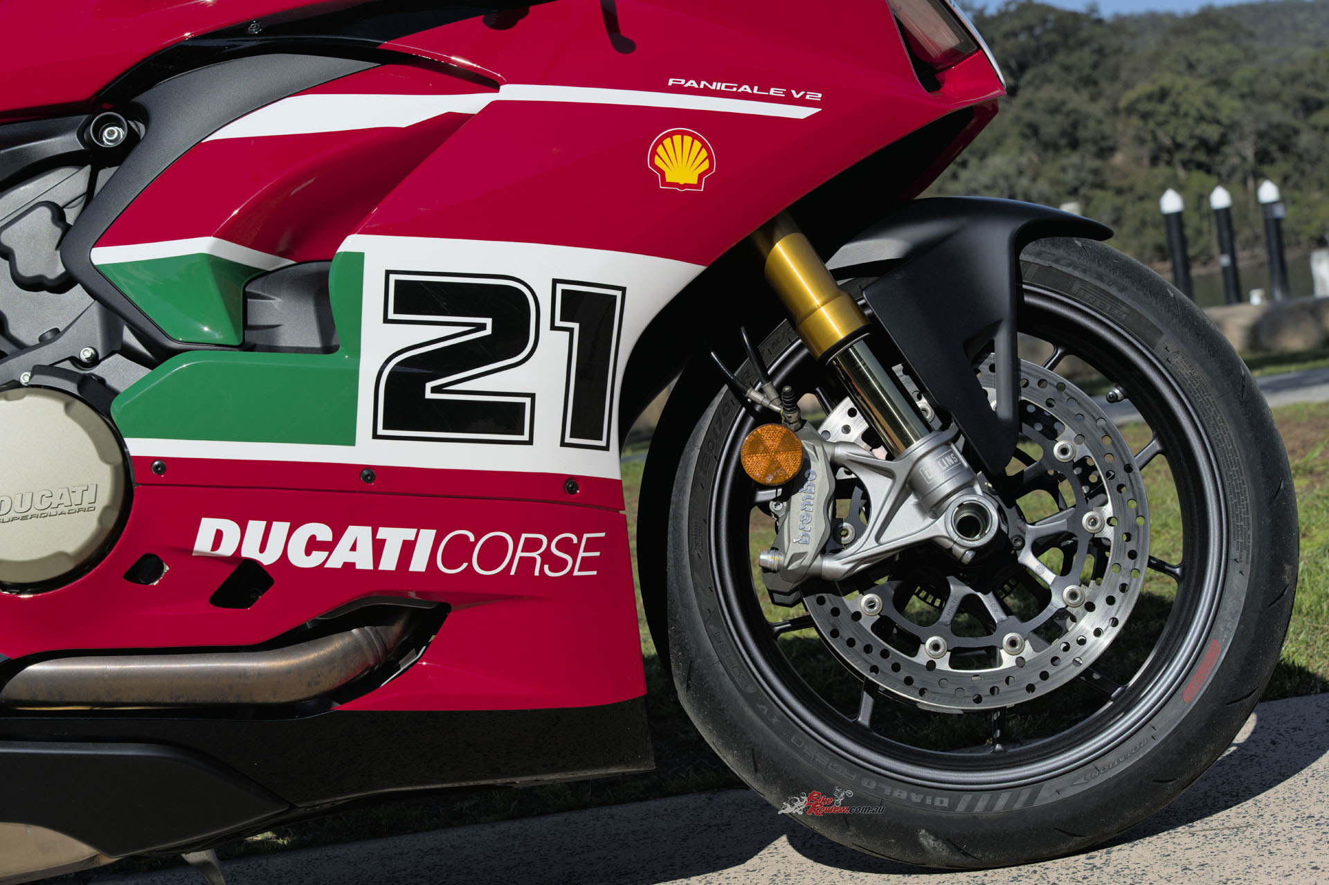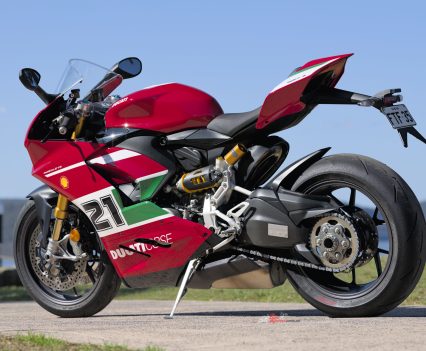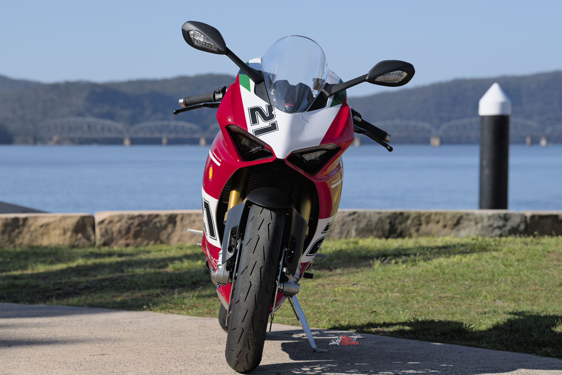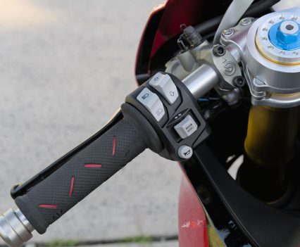 The special edition with #21 stitched in seat is comfortable enough for a few hours, the ‘bar position gives you control without folding you in half, and the narrow tank makes it easy to move around during cornering. At 187cm, I felt right at home. And the heat is not as bad as the V4, you will be glad to hear, but it still gets warm of course, but it’s not built for touring!