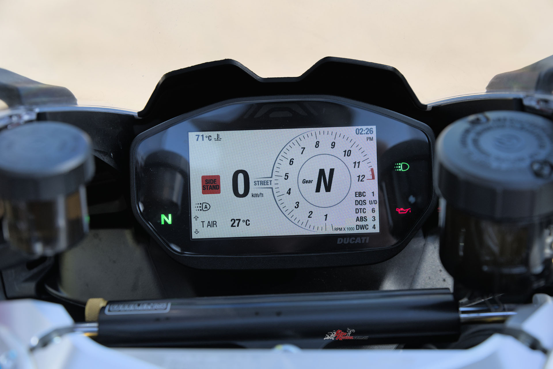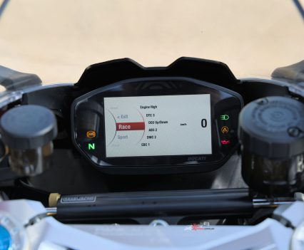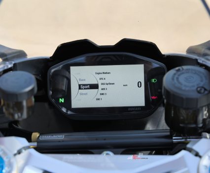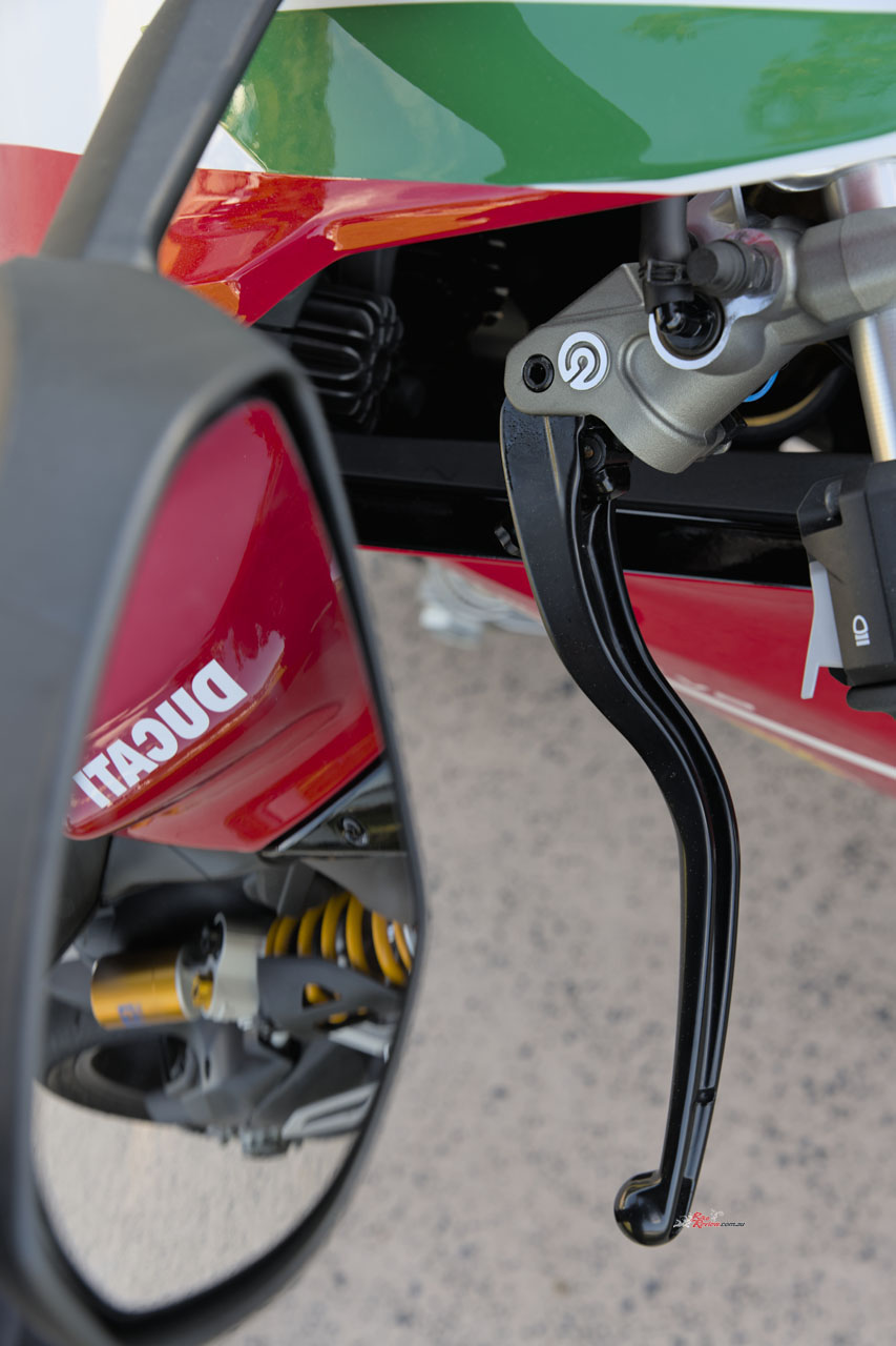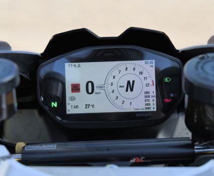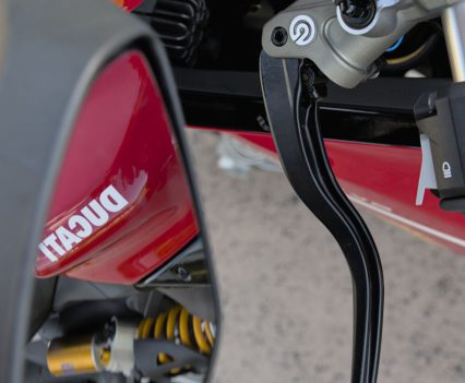 The switches are all standard easy to navigate, quality Ducati kit, the levers are adjustable and well placed, the dash is easy to see and read, and although they look nice, the mirrors are hard to see out of and vibrate a fair bit… The wide ‘bars and narrow tanks give the bike a racy feel, and the low screen adds to that. Overall, from a racer’s point of view, I love the riding position. From a street rider’s point of view, all I would do is fit a taller, tinted screen. I could live with the blurry mirrors…