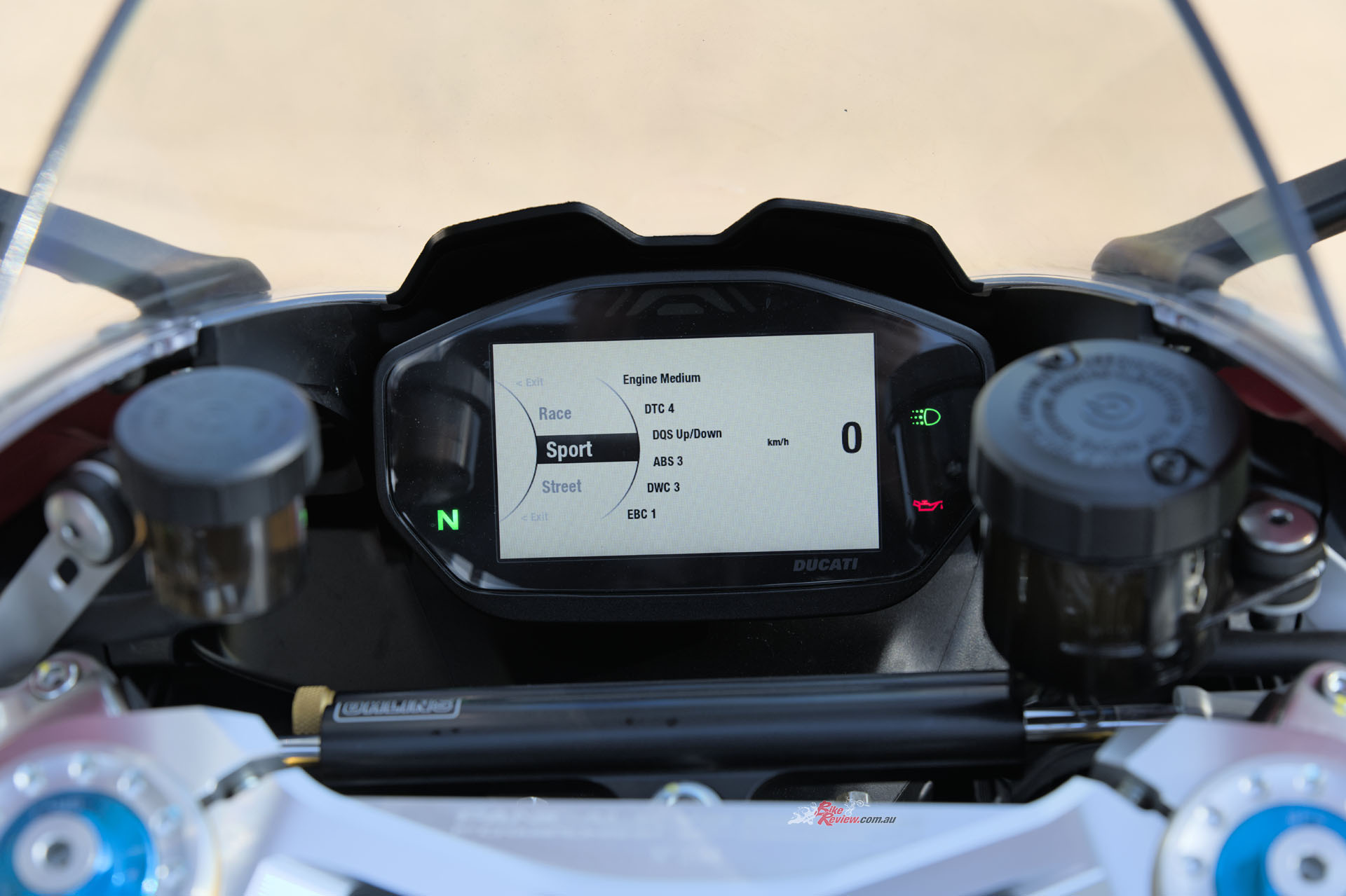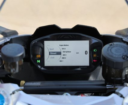 Fire up the 955cc Superquadro L-twin and it settles into a steady, purposeful idle with a crisp bark from the two-into-one with the carbon-wrapped outlet pipe. It sounds great for a legal exhaust. Rolling out in wet conditions first (seems to be my luck with sportsbikes), Street mode’s delivery keeps things drama-free and feels smooth, tractable and natural. Full power, smooth connection, and a forgiving safety net make it the sweet spot for spirited road riding in sketchy conditions. And with the softish suspension, feel is great in the wet, too…