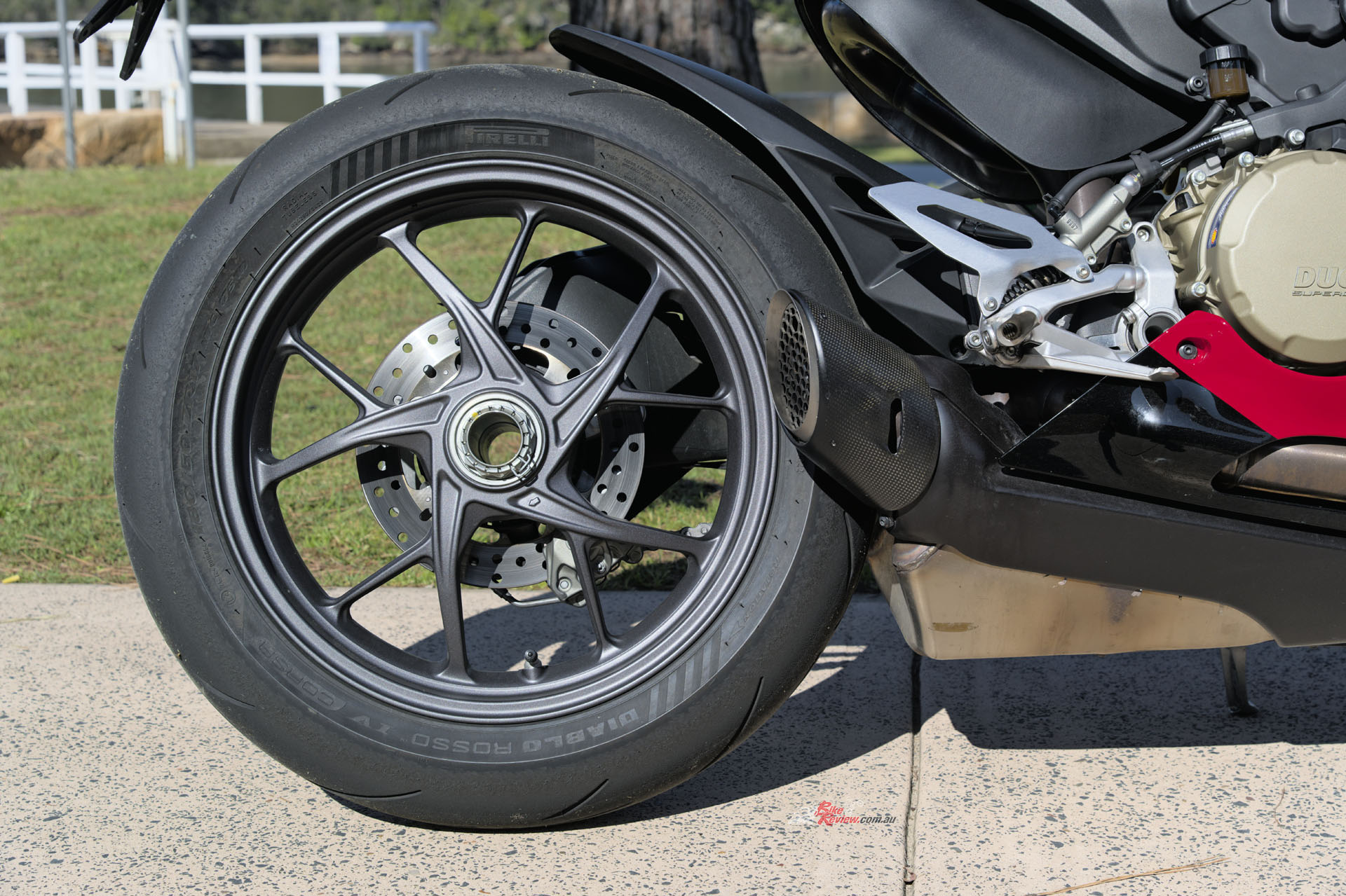 Braking is handled by Brembo with twin 320mm semi-floating discs and M4.32 monobloc calipers up front, a 245mm rear disc with twin-piston caliper, and Bosch cornering ABS. Wheels are cast aluminium 17-inch units shod with Pirelli Diablo Rosso Corsa II tyres (120/70 front, 180/60 rear).