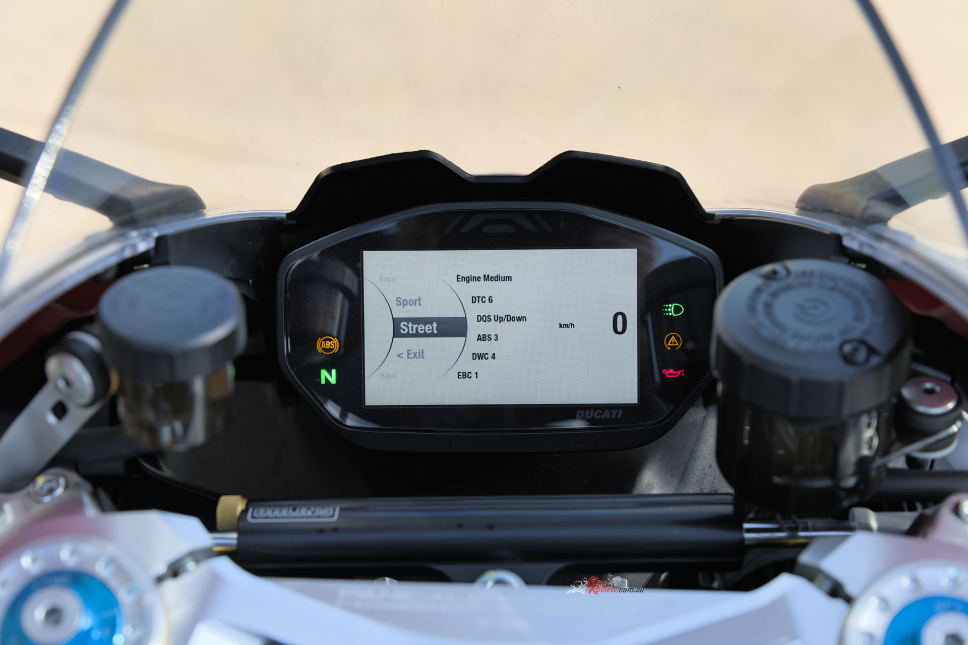 In Race mode, ABS intervention is limited to the front wheel only, giving experienced riders more freedom on corner entry. In short, the brakes are sensational, serious power but intimate feel and modulation. They are great on the road, in wet and dry, and by experience, they will be good on track.