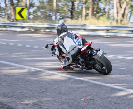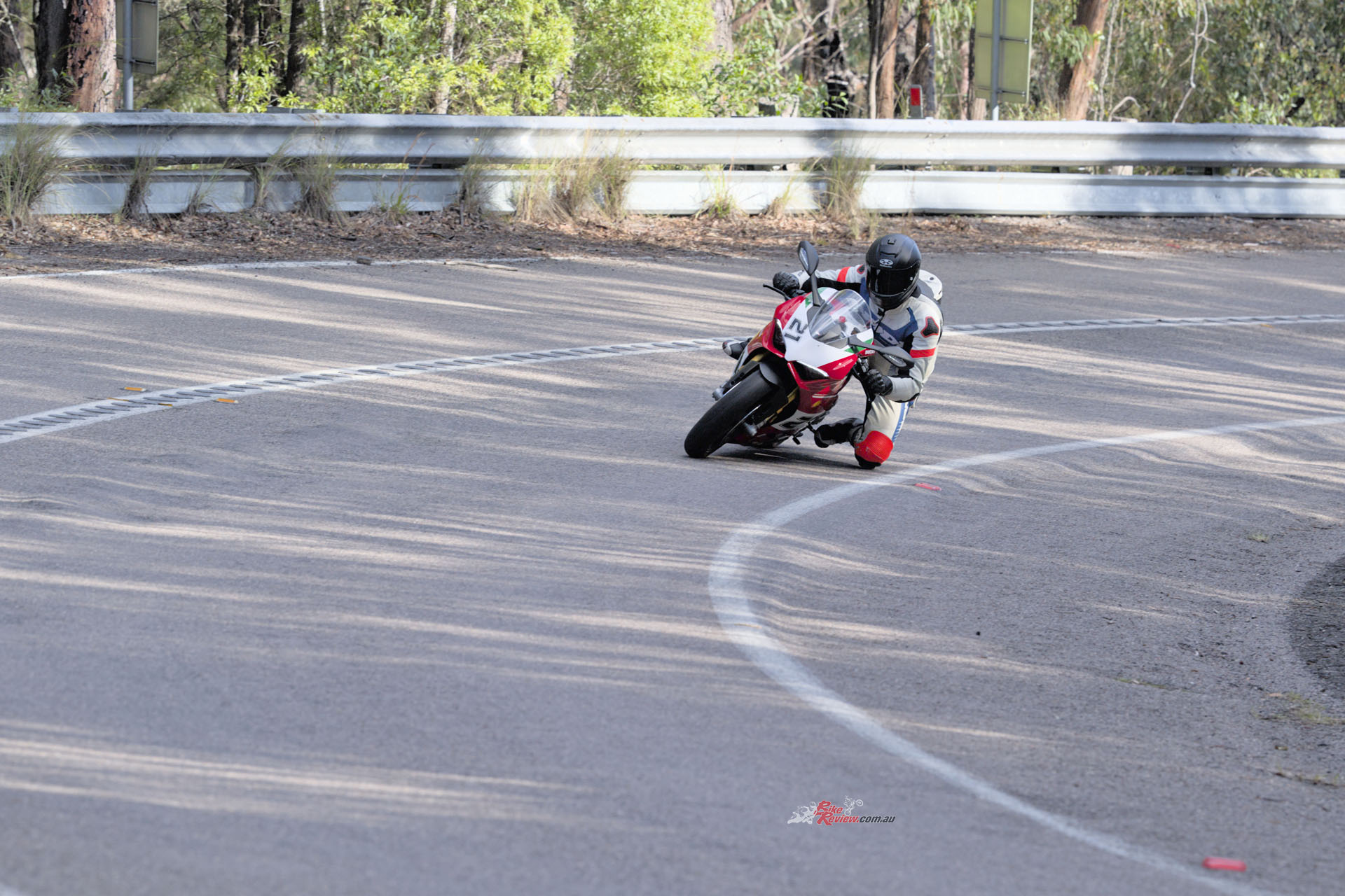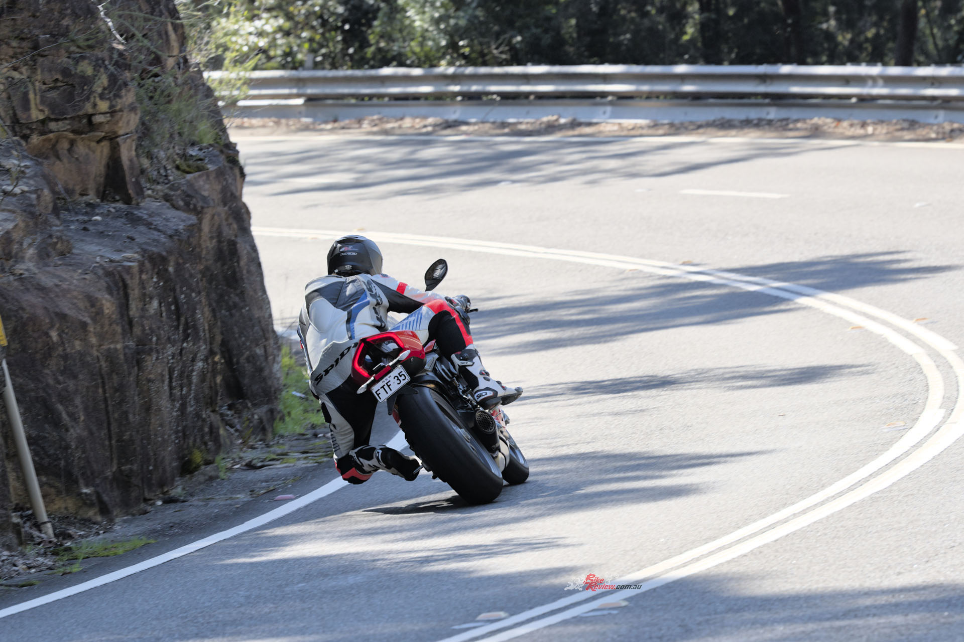 Straight out of the crate, the settings are well-judged for road use — plush enough to iron out mid-corner ripples, yet taut enough to keep the bike rock-solid at high speed. I could have gone harder on the settings, as you can see in a few shots, the rear is bottomed out in one dip in the road, and the front off the ground at the same time.