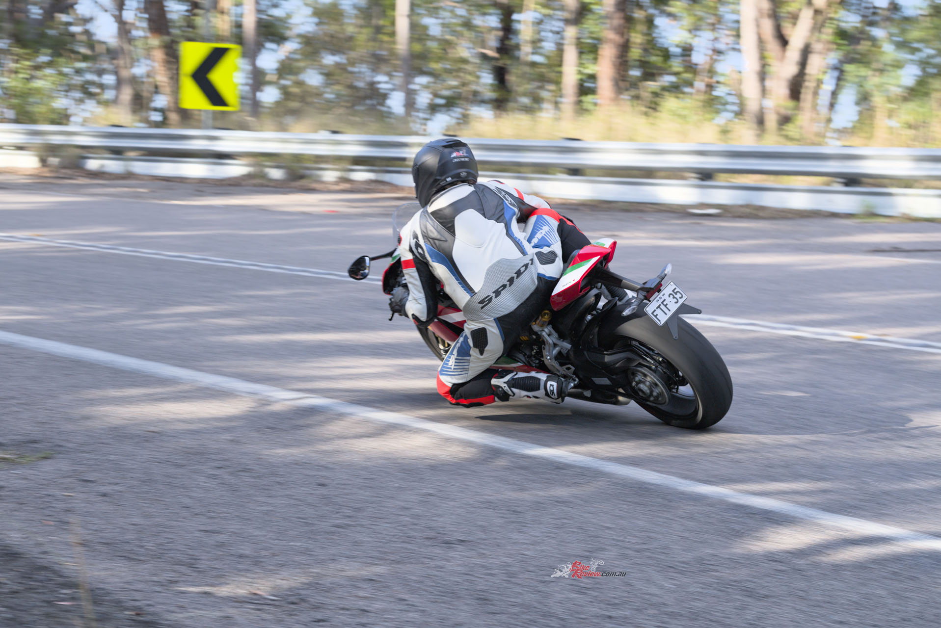 As the roads open up and the revs rise, the Bayliss V2 Panigale comes alive. Peak numbers are 155hp at 10,750rpm and 104Nm at 9,000rpm, but the real story is the delivery. There’s a thick, meaty torque curve from midrange that surges harder as you climb towards the redline. It’s a fairly peaky motor, and that is one thing I love about it, so rev happy, but it actually still has enough grunt low down to get lazy with the quick-shifter if you feel like just rolling from turn to turn or tooling around town as well…