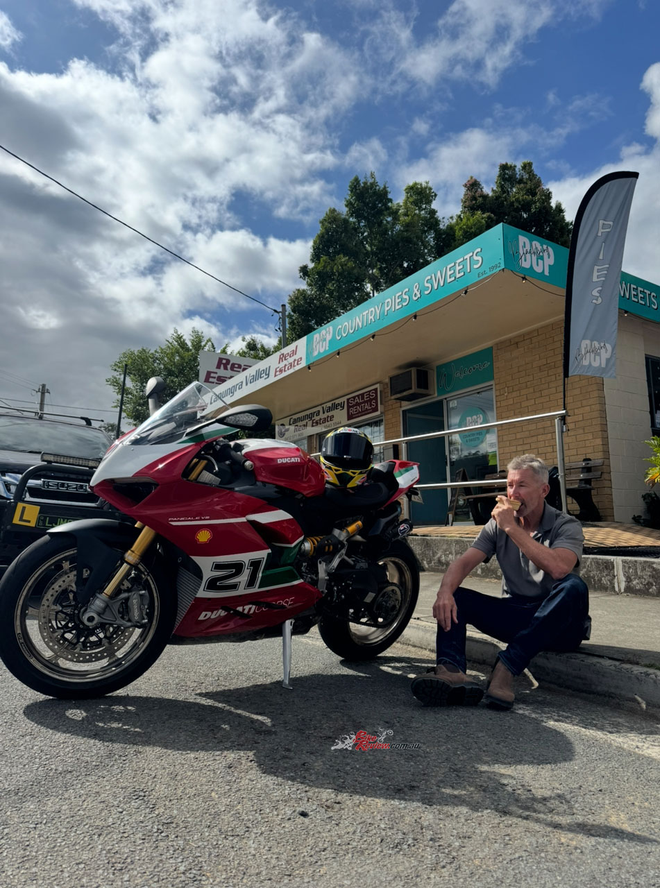 Troy Bayliss has a bunch of extras fitted to his own one, which is number #21 of course. Here he is enjoying an Aussie meat pie out on a ride on his bike… Pic: Bayliss archives.