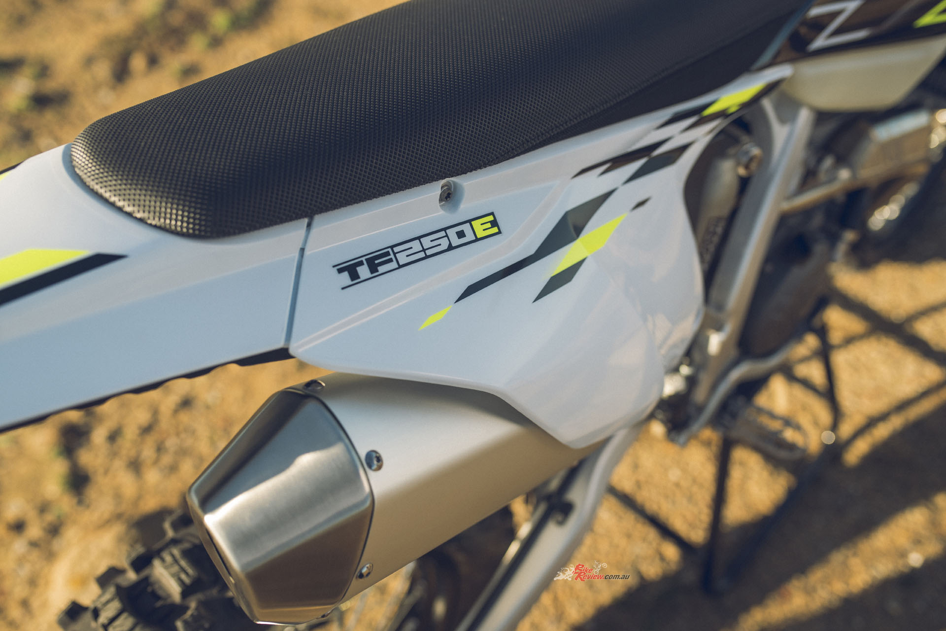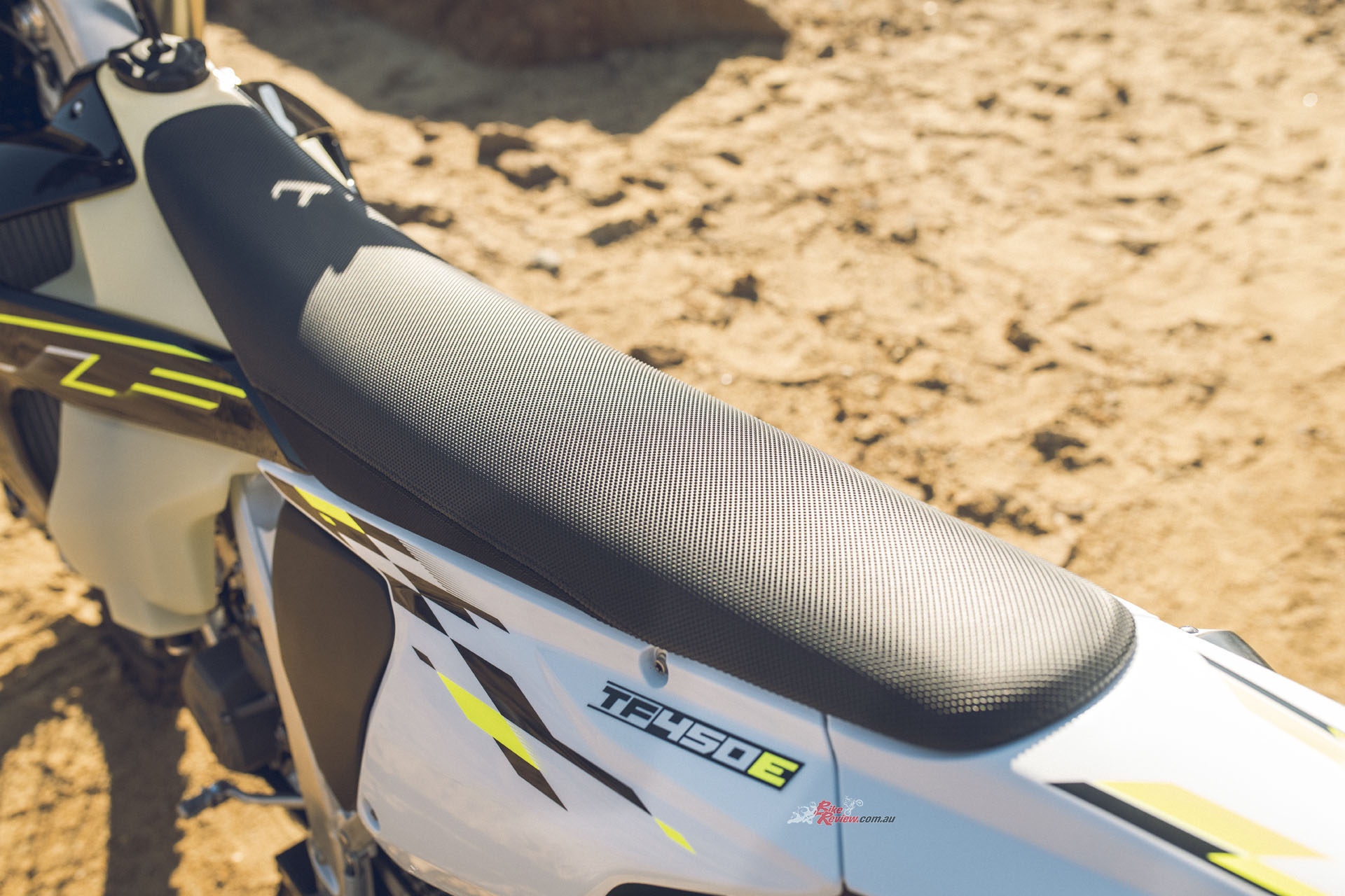 Both the TF 250-E and TF 450-E come with a Pyramid gripper vinyl seat, which provides excellent grip with a rubbery consistency that allows you to hold on to the bike in both wet and dry conditions all while being comfy for those long rides.