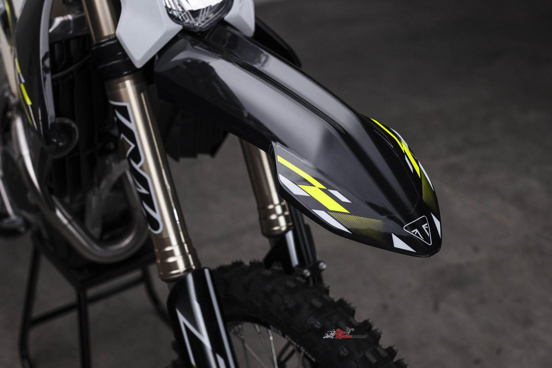 Both the TF250-E and TF450-E come equipped with KYP 48mm upside-down forks with compression and rebound adjustment and 300mm of travel, held on to the chassis by Neken 7075-T6 forged and fully machined lightweight aluminium triple-clamps.