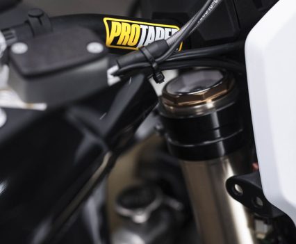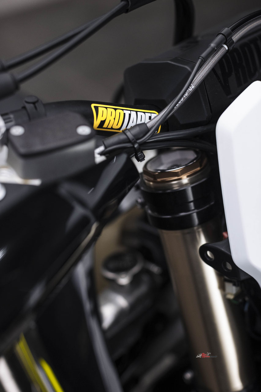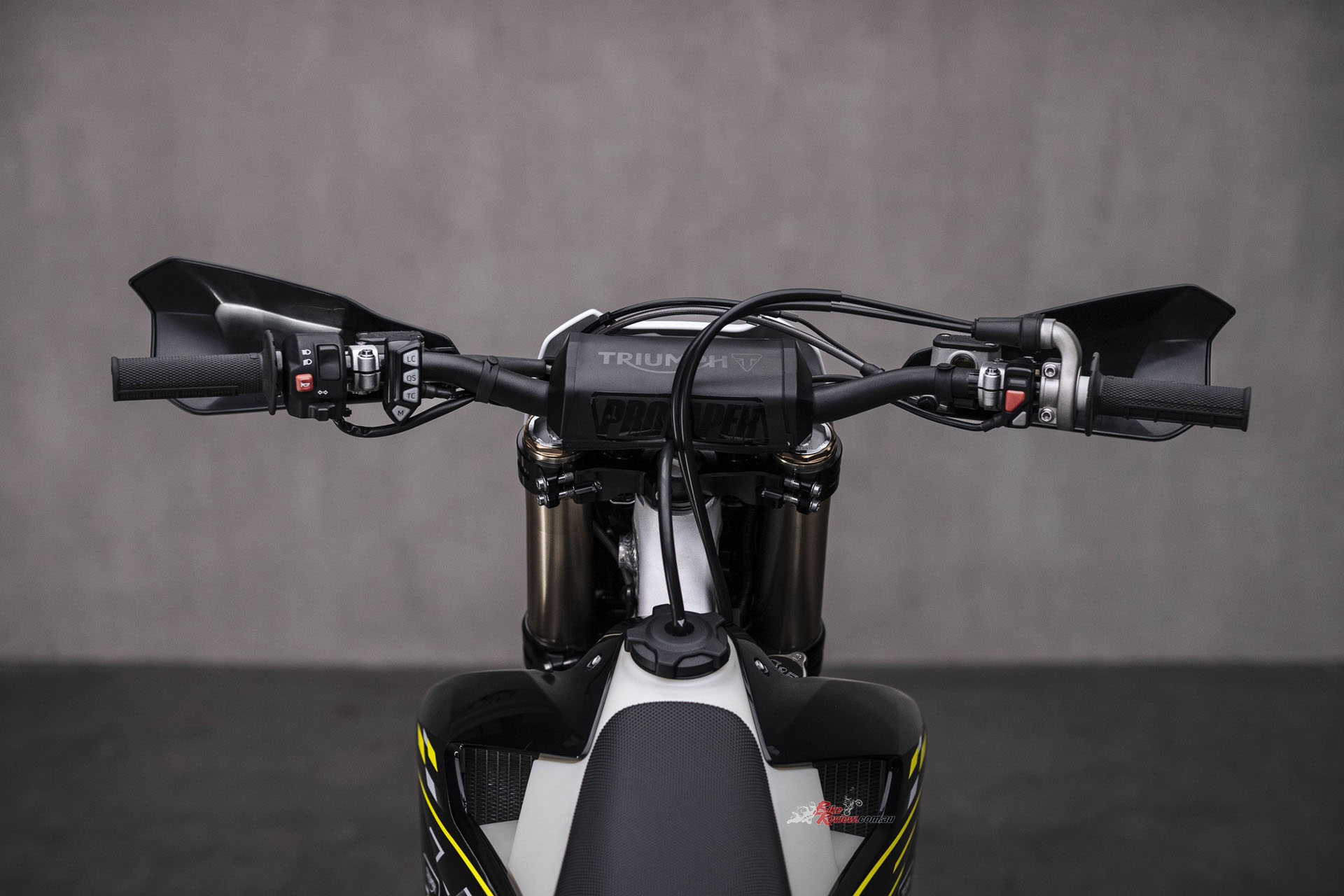 Both the TF 250-E and TF 450-E come with Pro Taper EVO ‘bars. Constructed of 4mm proprietary 7000 series aluminium alloy for impact strength and impact absorbing flex, with a Triumph/Pro Taper bar pad, paired with ODI half-waffle lock on grips for the best comfort.