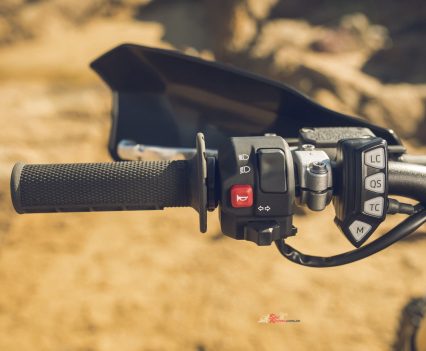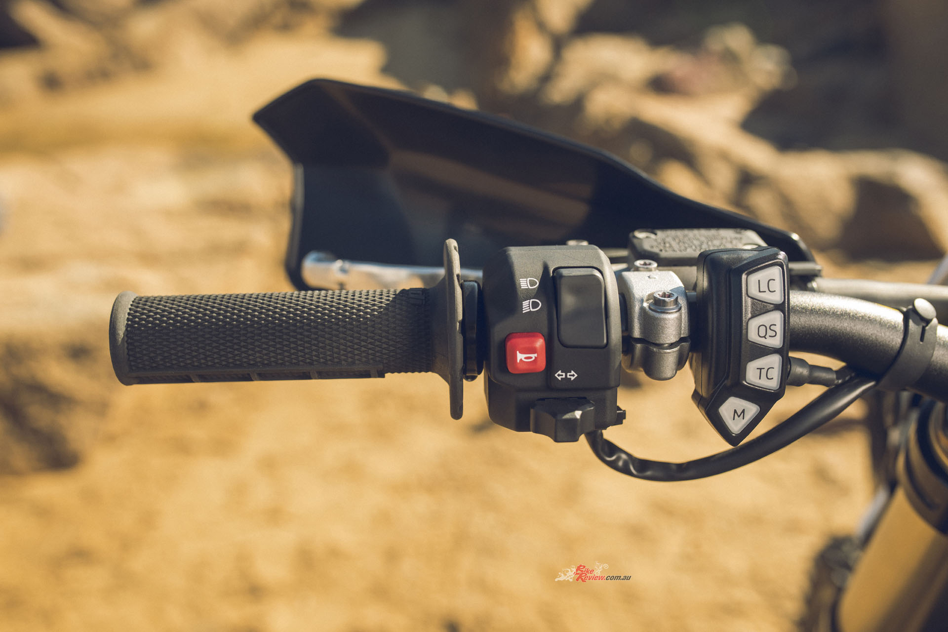 The left hand control module of the enduro models is identical to that of the motocross models with four buttons for easy selection. The first being LC launch control, for holeshot winning starts, by managing torque delivery to maximise traction off the line. The second QS quick-shift, to enable clutch-less upshifting between 2nd and 6th gear for uninterrupted power delivery to maintain momentum.