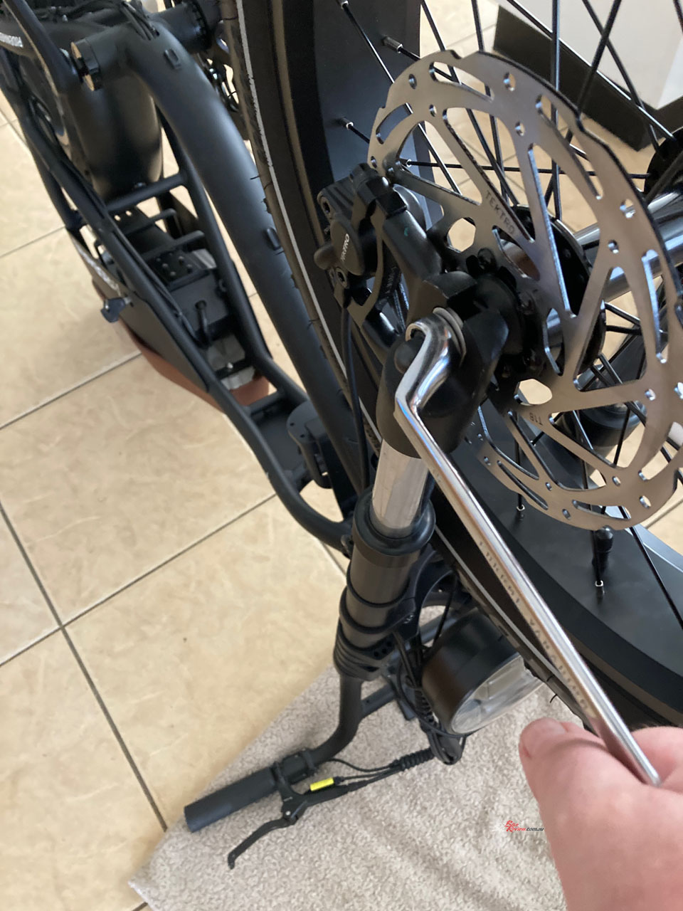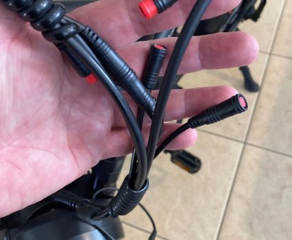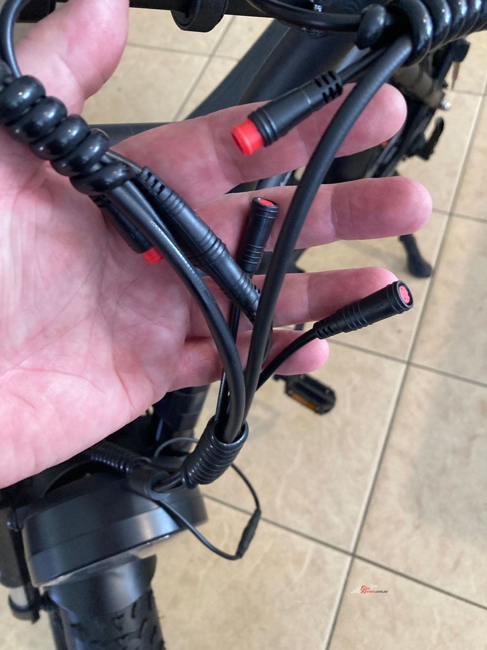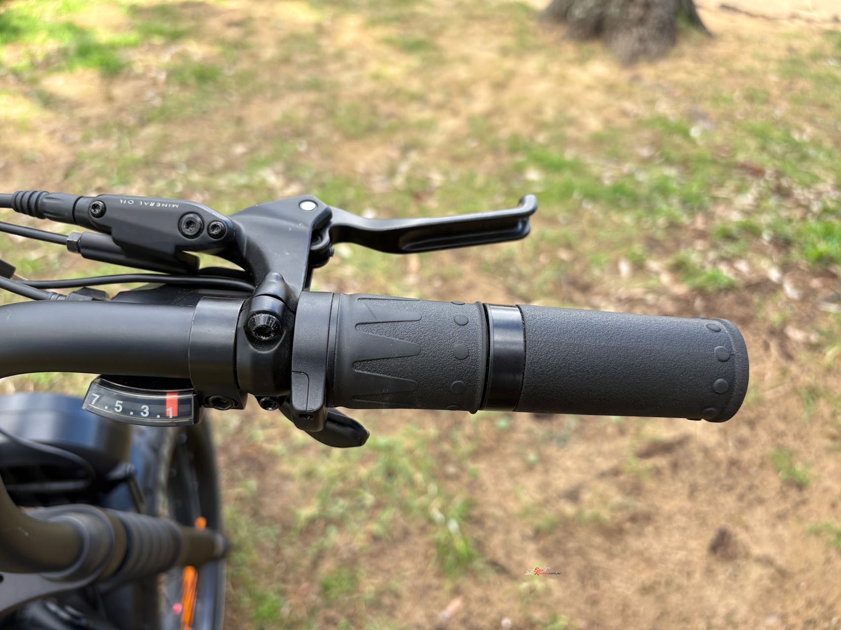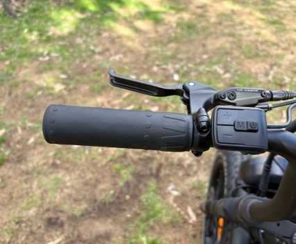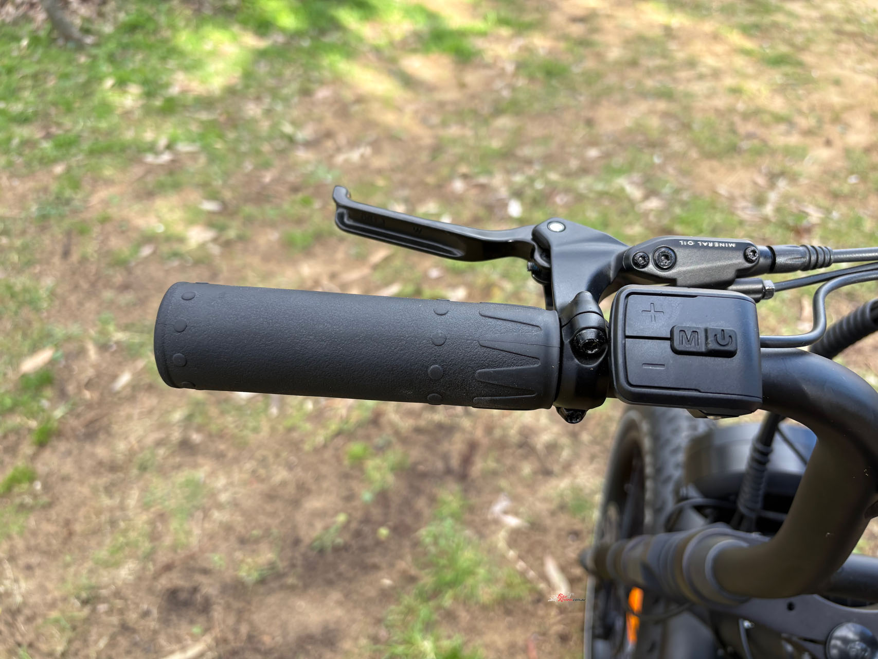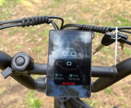 Braking is handled by Tektro hydraulic discs with 180mm rotors front and rear, complete with motor cut-off. The feel is strong and progressive, and the system easily manages the bike’s weight even with a passenger, but if you trail the brakes as you start to pedal, it will cause some hesitation that can be annoying. The seven-speed Shimano drivetrain is simple and reliable, shifting cleanly under light load. With a 48-tooth front chainring and wide rear freewheel, gearing covers city and light-trail duties comfortably whiile being good on the open road and cycle pathways.