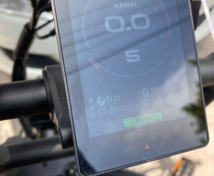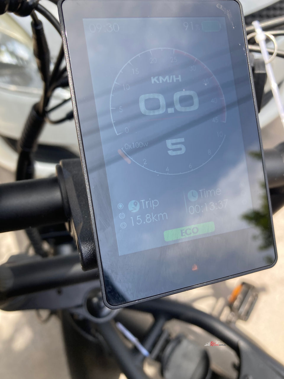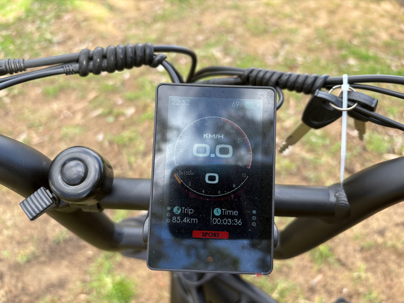 The 48V 20Ah Samsung battery proved outstanding in real use. We regularly achieved between 75km and 100km per charge, depending on mode and terrain. Charging is straightforward and the removable pack is well-protected inside the frame. The OLED display is crisp and waterproof, showing speed, battery, assist level, time and trip data at a glance.
