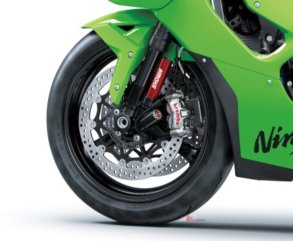 Suspension is by KYB, with the ZX-10R fitted with the Balance Free Front Fork (BFF) and BFRC lite rear shock, both retuned for 2026. An Öhlins electronic steering damper remains standard. The retuned damping settings aim to improve weight transfer under braking and acceleration, helping maintain tyre contact and predictable feedback through fast direction changes.