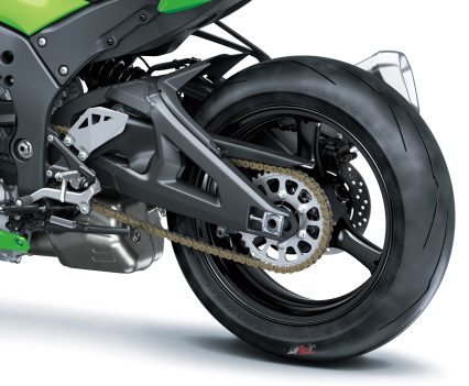 The braking system continues with Brembo M50 monobloc calipers and 330mm discs, supported by a radial-pump master-cylinder. The ZX-10RR further benefits from steel-braided brake lines as standard, while the ZX-10R retains rubber hoses. Tyres differ between models, with the ZX-10R running Bridgestone Battlax Racing Street RS12s and the ZX-10RR Pirelli Diablo Supercorsa SP V3s.