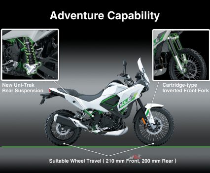 The chassis design features a 21-inch front and 17-inch rear wheel setup, using IRC GP-410 tyres to balance road grip with dirt-trail traction. Suspension is handled by long-travel KYB units, tuned to provide confident handling on broken surfaces without compromising highway composure. Braking performance comes from powerful brakes with selectable ABS, allowing riders to tailor the system for loose-surface conditions.