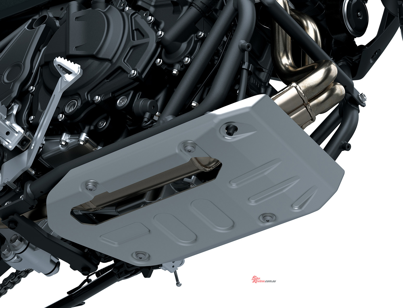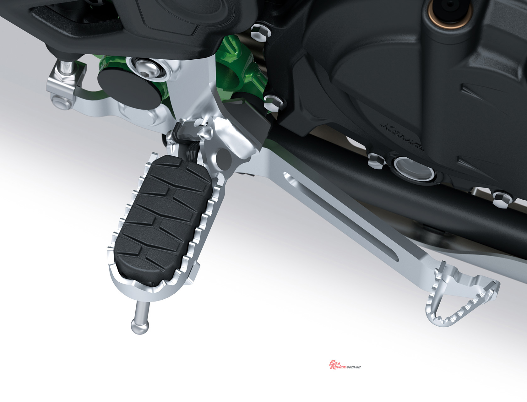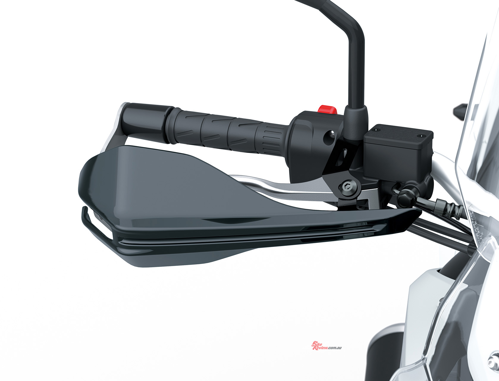 Kawasaki Genuine Accessories: Top case and bracket, panniers, rear carrier, large windshield, hand guards, grip heaters, USB Type-C, LED fog lamps, skid plate, engine guard, low seat, ERGO-FIT pillion seat, centre stand, radiator screen, GPS bracket, accessory relay.