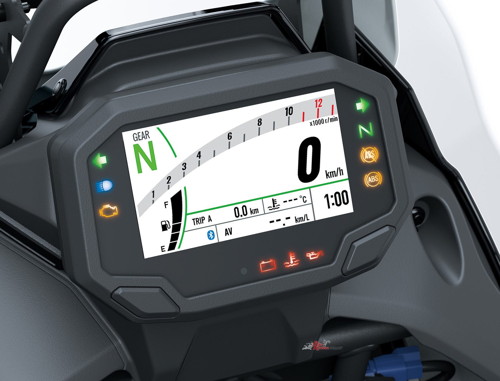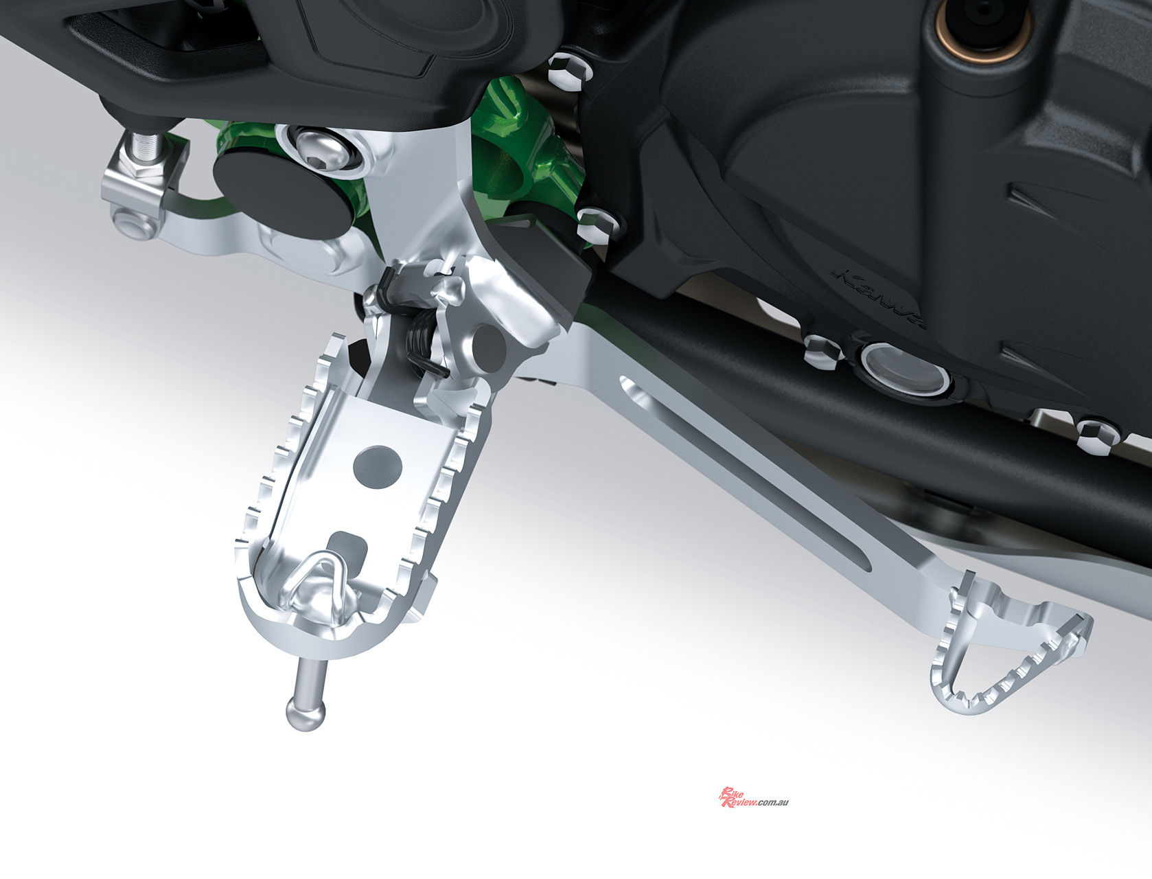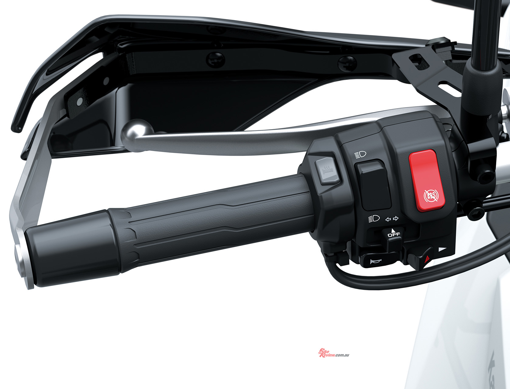 Kawasaki Genuine Accessories: Top case and bracket, panniers, rear carrier, large windshield, hand guards, grip heaters, USB Type-C, LED fog lamps, skid plate, engine guard, low seat, ERGO-FIT pillion seat, centre stand, radiator screen, GPS bracket, accessory relay.