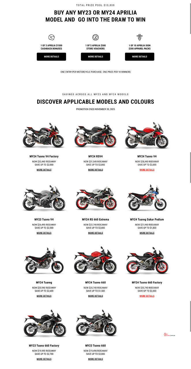 Save up to $2700 with Aprilia Australia’s Race Out Sale | During the lead-up to the 2025 Australian Motorcycle Grand Prix, a limited-time promotion offering riders the chance to secure an iconic Aprilia motorcycle with exceptional savings and added rewards is happening! Press: Aprilia AustraliaRunning now through November 30, 2025, the Aprilia Race Out Sale delivers savings of up to $2700 across the MY23 and MY24 model line-up. The promotion applies to a wide range of Aprilia’s acclaimed machines, from road-ready supersports to high-performance nakeds, ensuring there is an option for every type of rider. Customers can view the full list of eligible models at aprilia-promotions.com.au.
