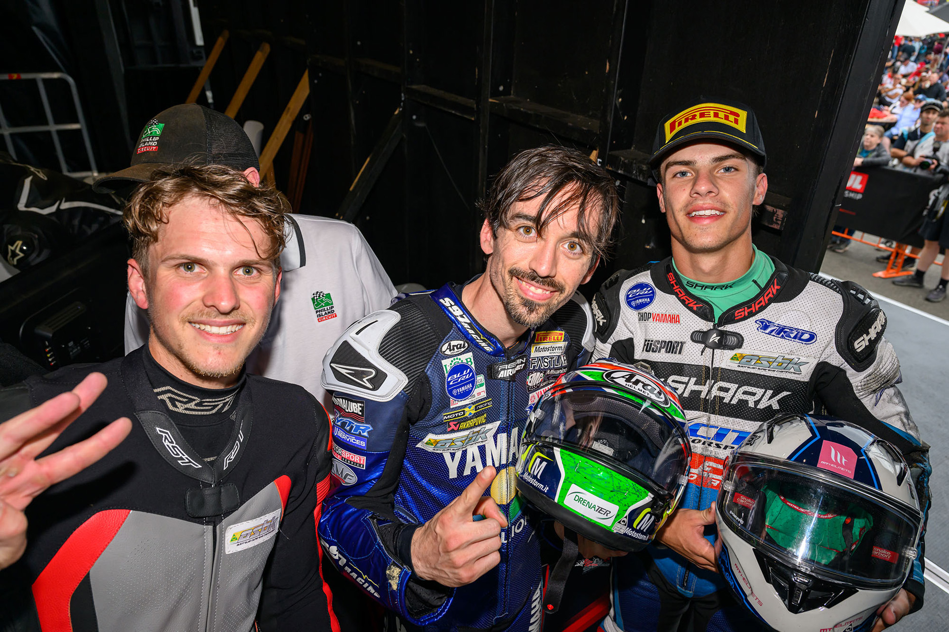 Declared a wet race but ridden at dry-race intensity, the final Kawasaki Supersport/Supersport Next Gen encounter delivered one of the finishes of the season. Olly Simpson (DesmoSport Ducati) claimed victory by a scarcely believable 0.001 seconds after drafting past Tom Toparis (Stop and Seal Ducati) at the line.