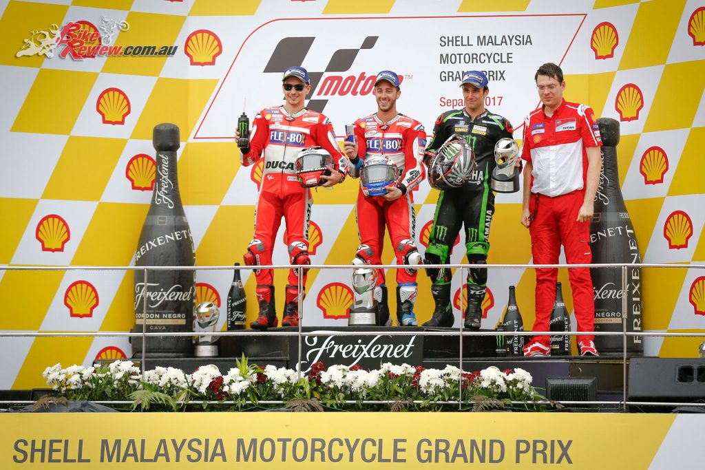 The dual Ducati podium at Sepang, with Johann Zarco third
