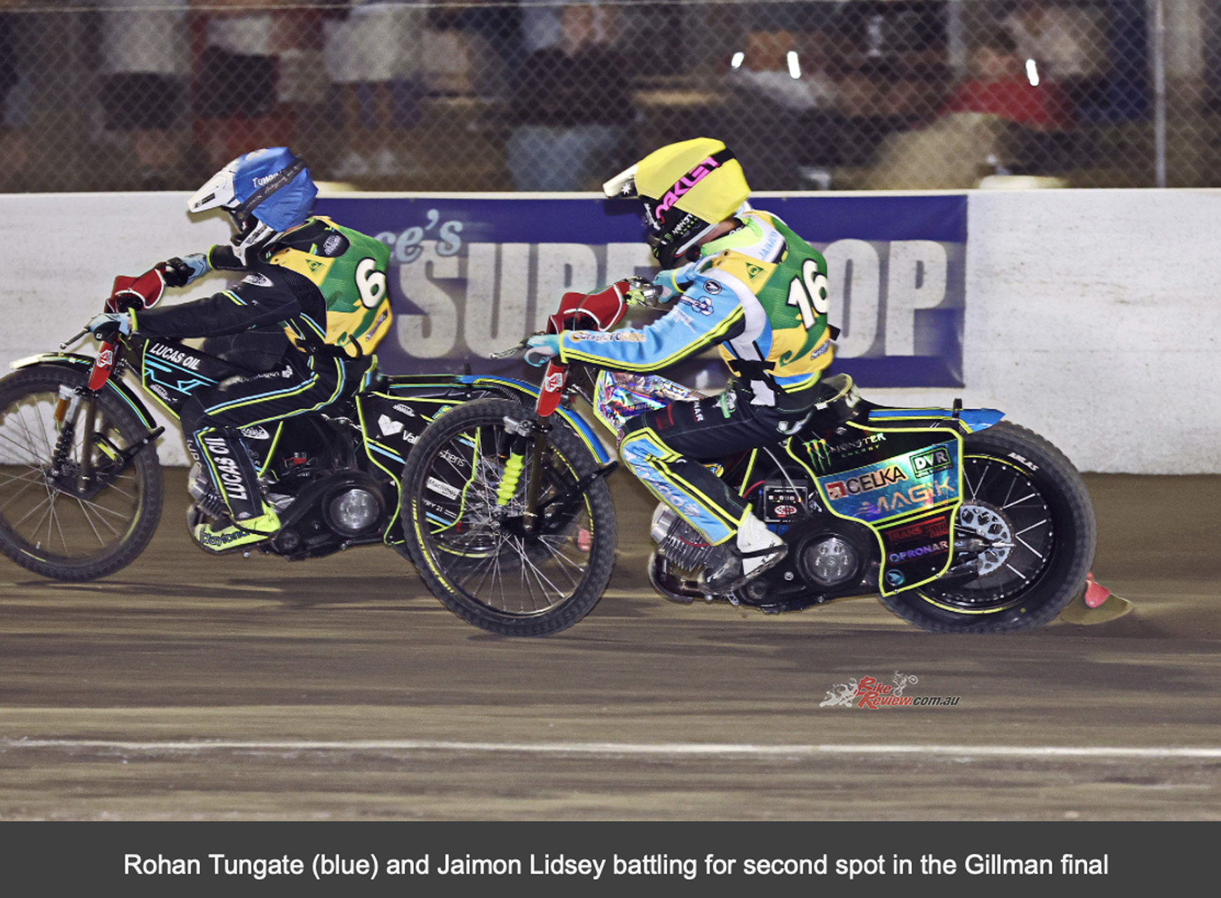 In the Gillman heats, Tungate’s unbeaten performance underscored his championship credentials as he progressed straight through to the final alongside Holder. Ben Cook, Lidsey, Keynan Rew, Justin Sedgmen, Mitchell McDiarmid, Reid Battye and Tate Zischke also featured in the semis under tricky track conditions.
