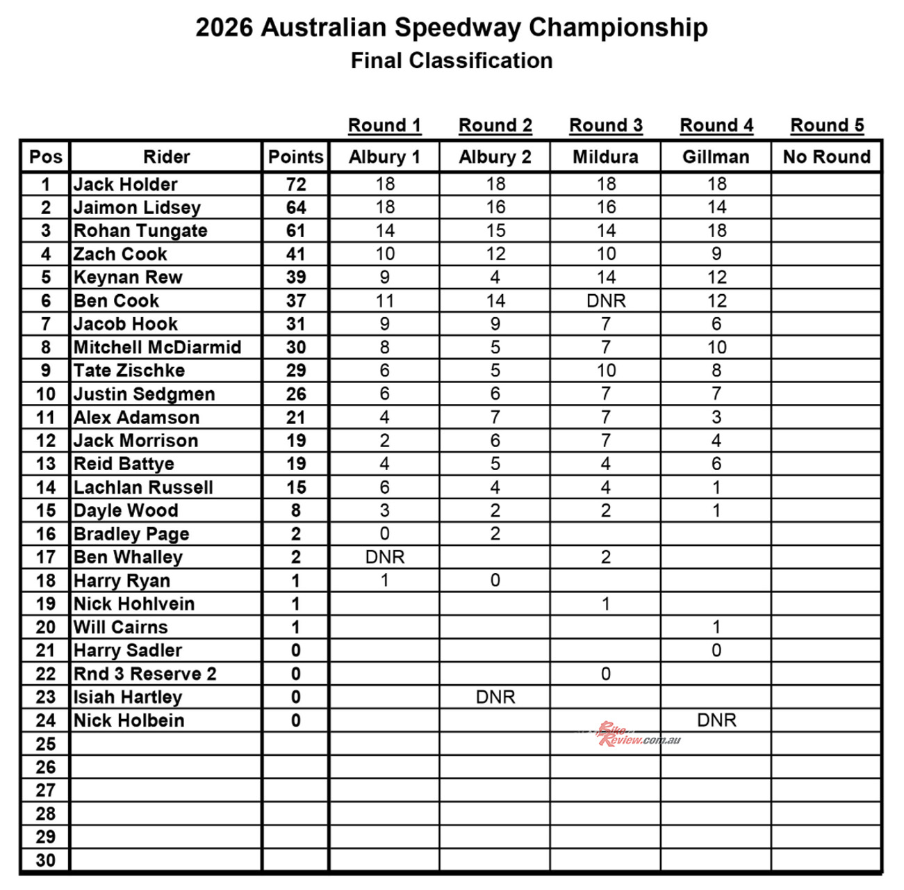 Holder’s victory marks a remarkable campaign of consistency — four round wins from four starts — and lays a strong platform for a hectic season ahead in the UK and Europe, including World Speedway Grand Prix action as he chases the distinction of becoming the first Aussie world champion since Jason Doyle in 2017.