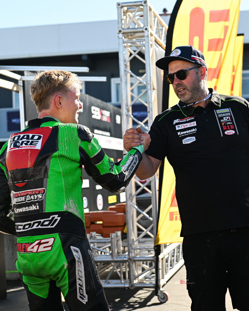 Qualifying on Saturday, Hayden Nelson delivered a stunning performance to take P1 in Supersport, with teammate Tom Edwards close behind in P3. Nelson backed up his pace with consistent results on race day, finishing second and third in the opening pair of races. Edwards was equally impressive, scoring a narrow victory in Race 2 by just 0.045 seconds and ending the weekend as the highest-point scorer for Kawasaki.