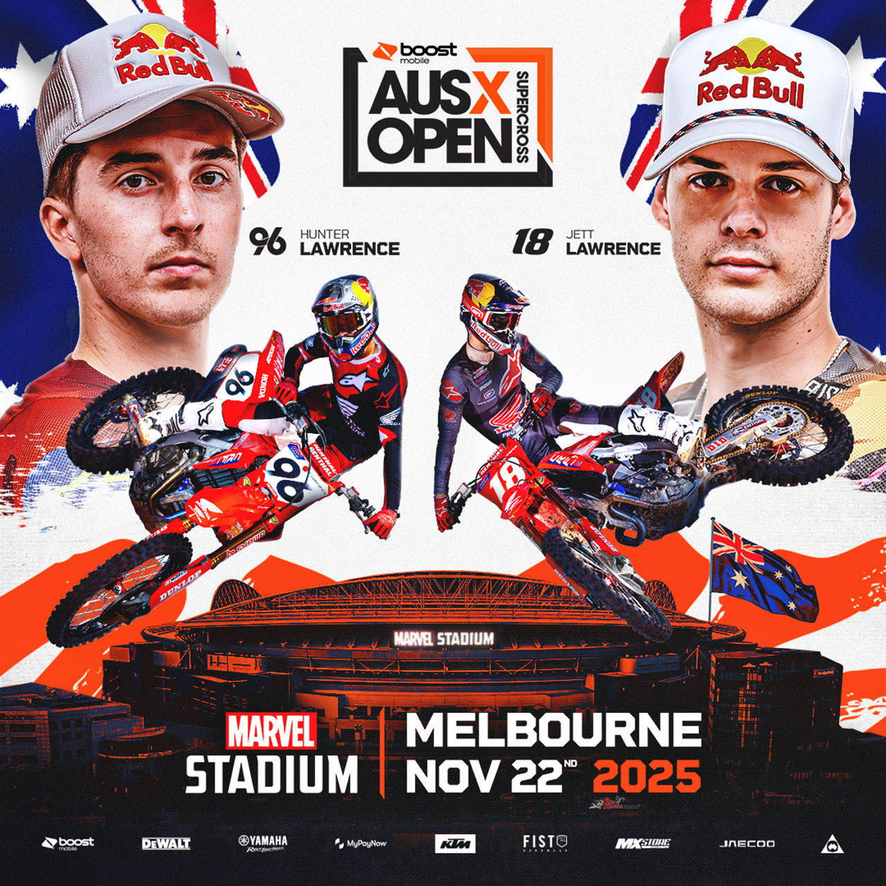Two of Australia’s biggest global motorsport stars, Jett and Hunter Lawrence, will return home to headline the 2025 Boost Mobile AUSX Open Supercross at Melbourne’s Marvel Stadium on Saturday, November 22, in front of a massive crowd of fans. Press: AUSX Media