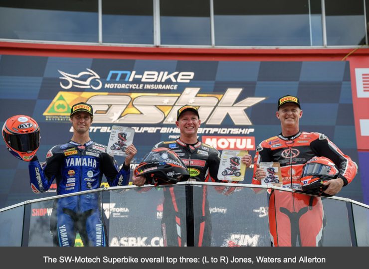Starting bright and early at 8:55am, Jones (Yamaha Racing Team) reinforced his reputation as a master of the Ipswich circuit. Despite running wide on lap five and surrendering second to Glenn Allerton, Jones regrouped with a race-best lap of 1:07.646 to close on polesitter Waters. By lap 12, he made his decisive move at turn two, holding off the Ducati rider for a hard-fought win.