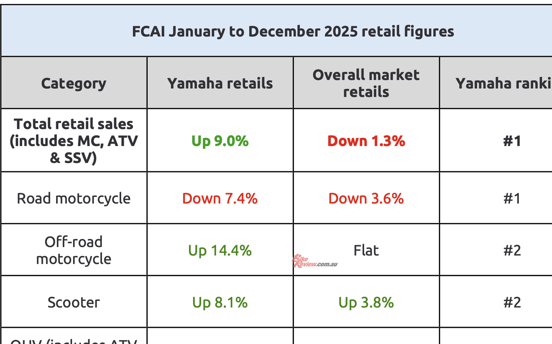 According to FCAI January–December 2025 retail figures, Yamaha grew total retails by 9.0 per cent in a market that declined by 1.3 per cent overall. It marks only the fourth time in 23 years of FCAI-reported data that Yamaha has led total retail sales, and follows directly on from the brand’s strong 2024 performance.