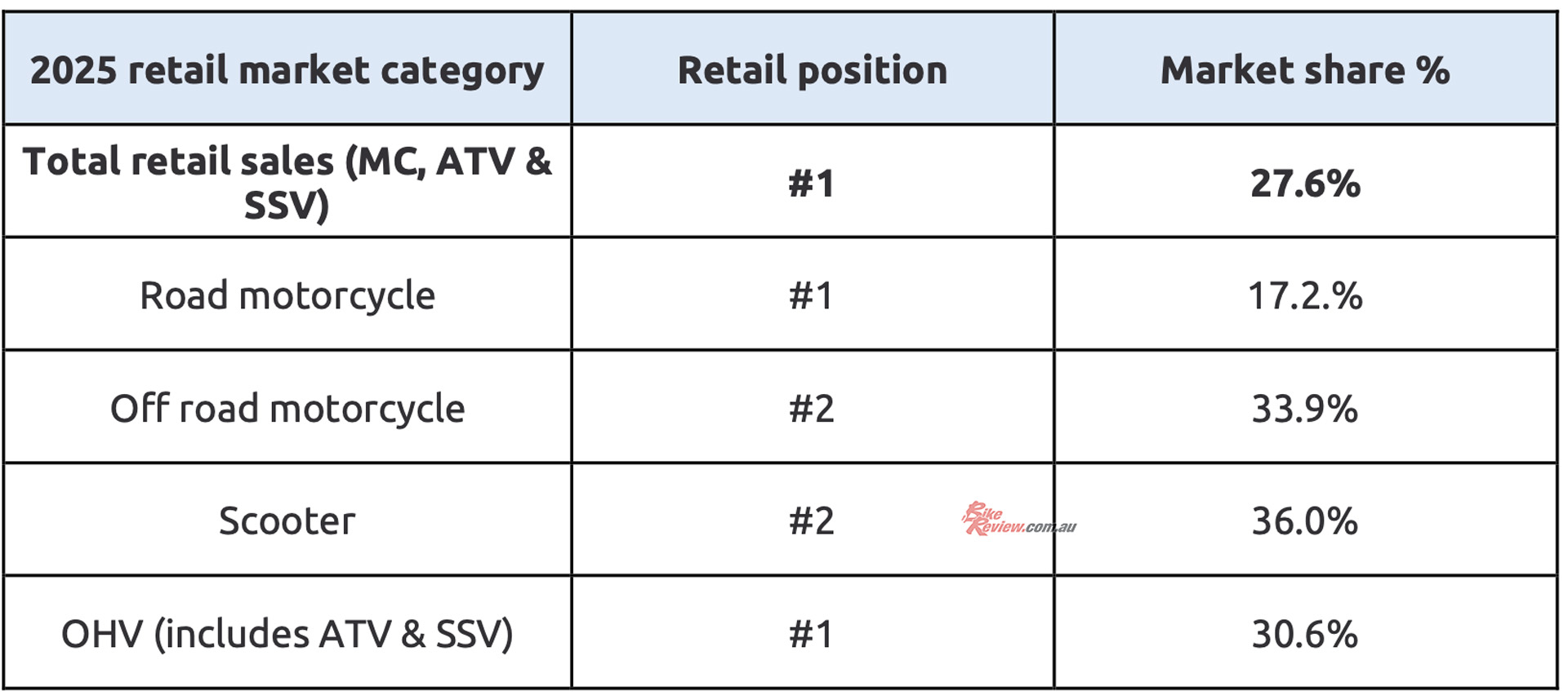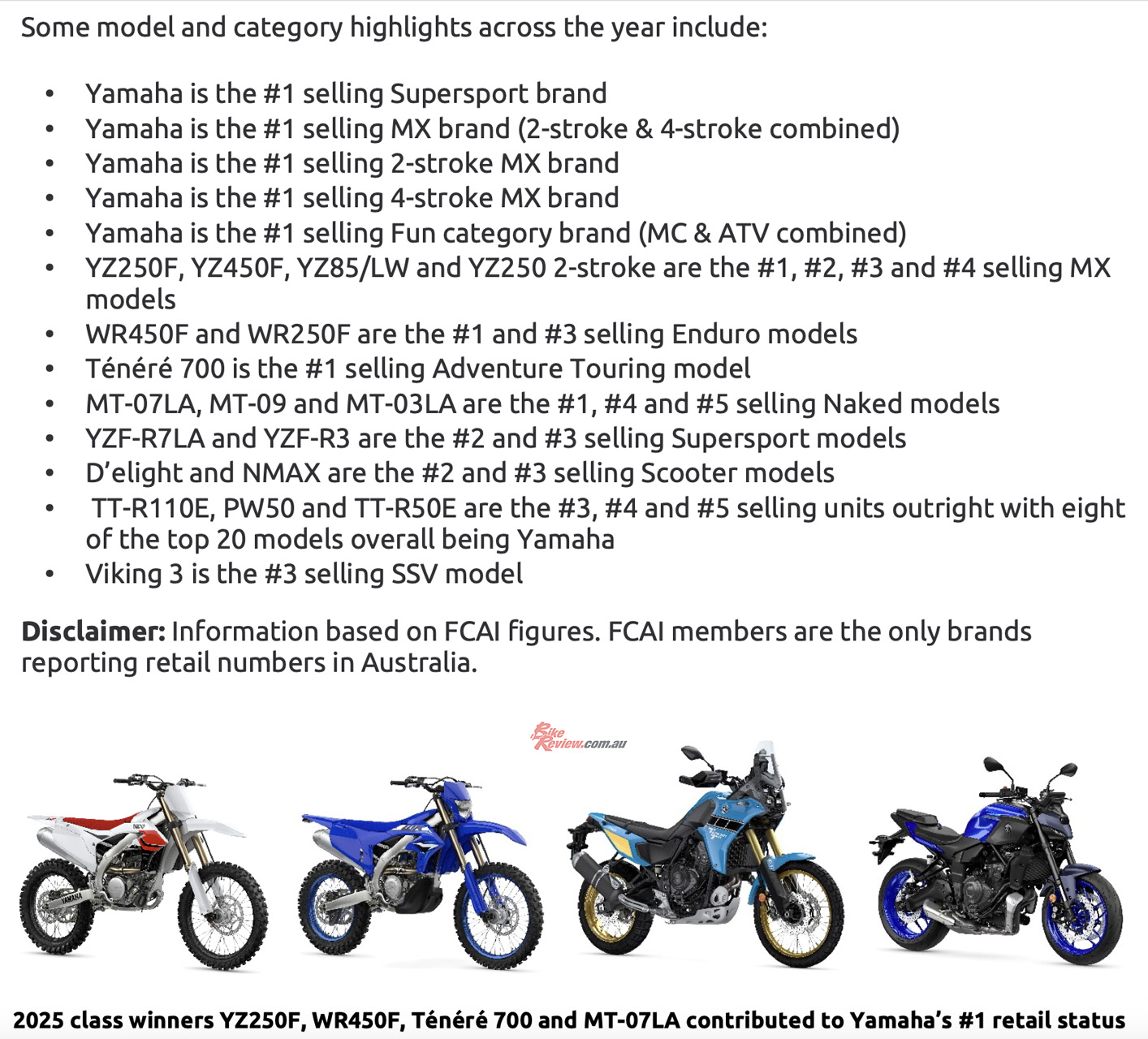 Yamaha finished 2025 with a total market share of 27.6 per cent across all categories, meaning more than one in every four vehicles sold in Australia carried the tuning fork badge.