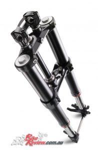 Revised 43mm WP forks are non-adjustable but a significantly up-spec fork to what is being normally offered in the category