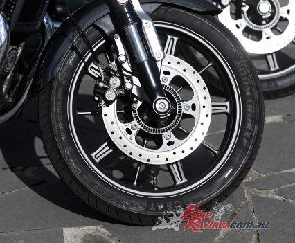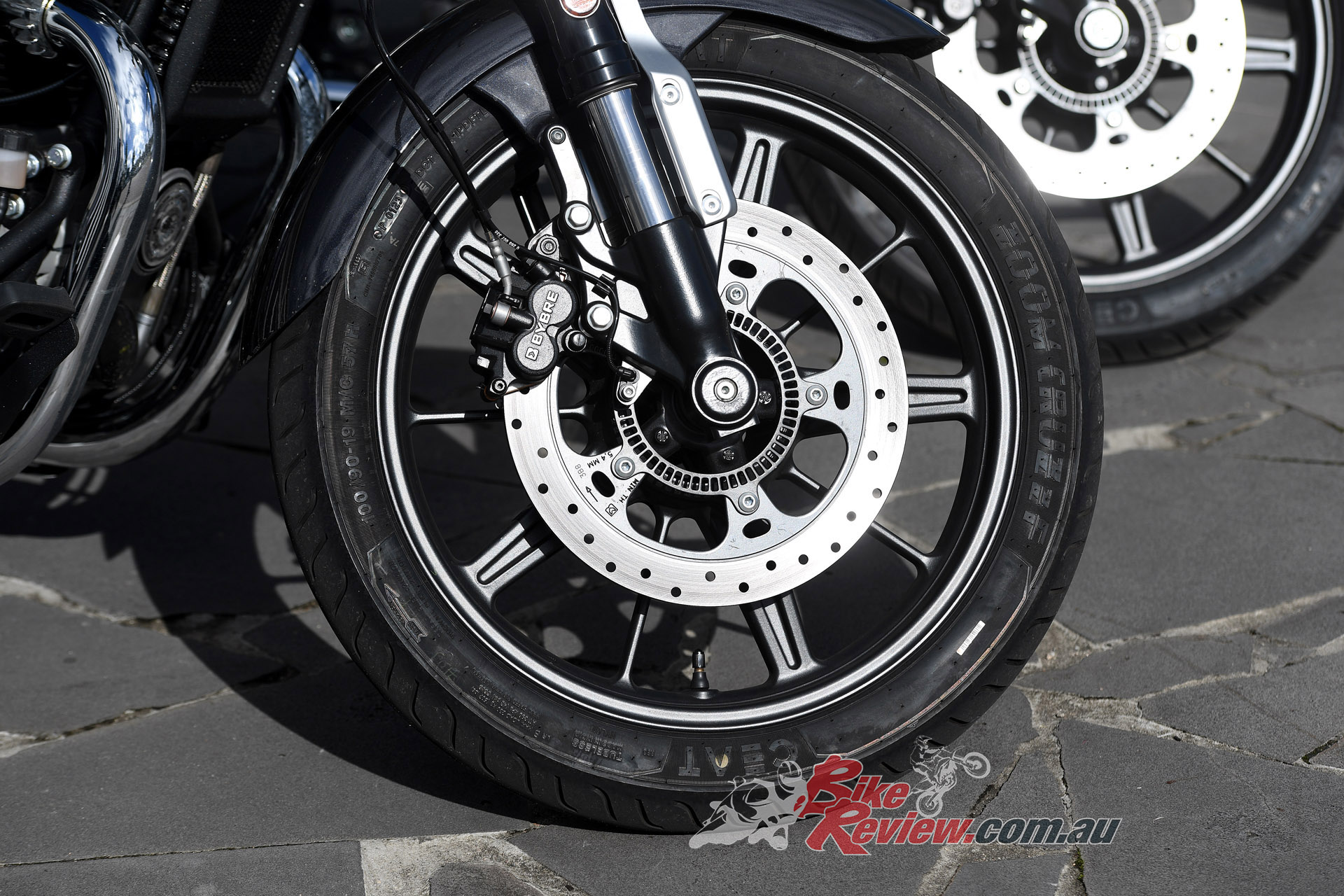 Brakes: 320mm disc, twin piston floating caliper (f), ABS, two-piston, 300mm rotor, twin piston floating caliper (r) Tyres: 100/90 – 19 M/C 57H (f) 150/80 B16 M/C 71H (r)