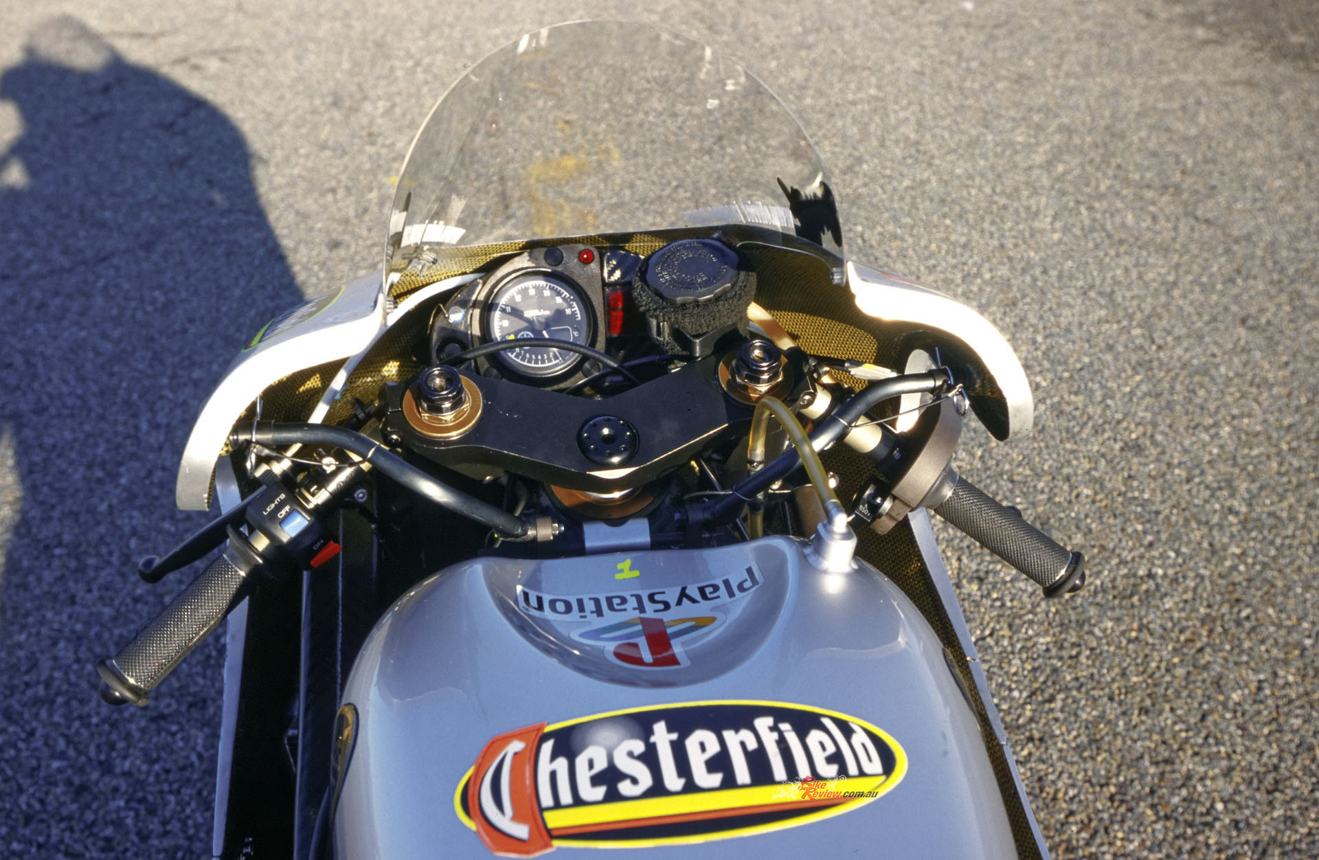 But there was more. Like the beautifully-welded factory-built titanium exhausts surmounted at one end by French MIG silencers, and at the other by Yamaha’s trademark power-valve system. Or the German-made PVM forged magnesium wheels, which saved a crucial 150gr of unsprung weight at the front, compared to cast magalloy ones, and twice as much at the rear.