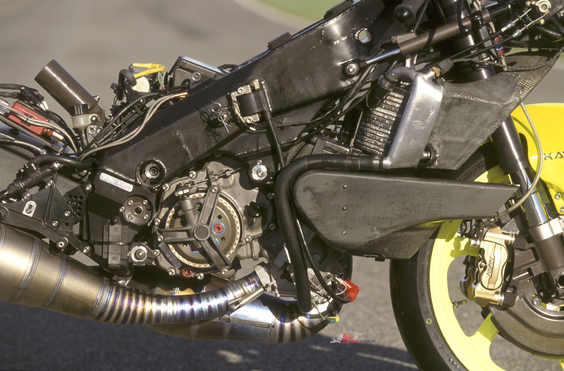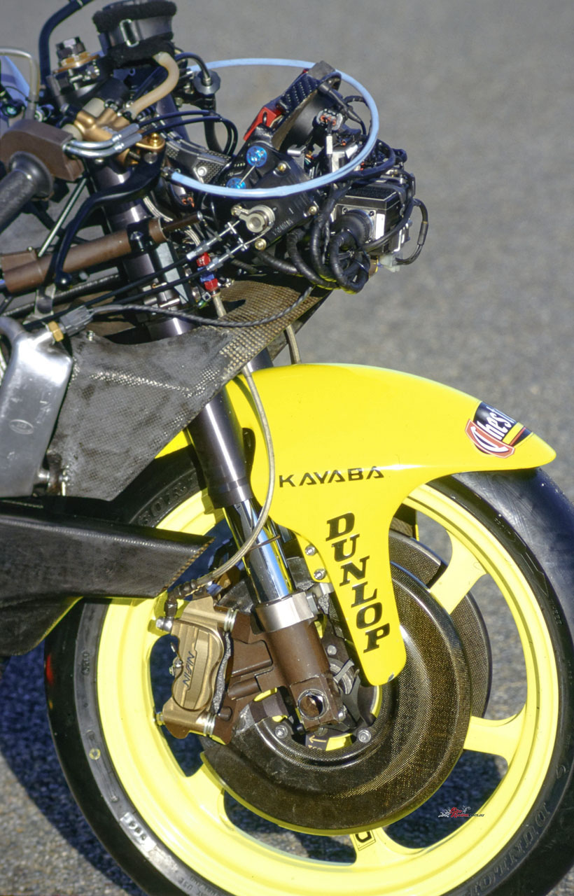 But there was more. Like the beautifully-welded factory-built titanium exhausts surmounted at one end by French MIG silencers, and at the other by Yamaha’s trademark power-valve system. Or the German-made PVM forged magnesium wheels, which saved a crucial 150gr of unsprung weight at the front, compared to cast magalloy ones, and twice as much at the rear.