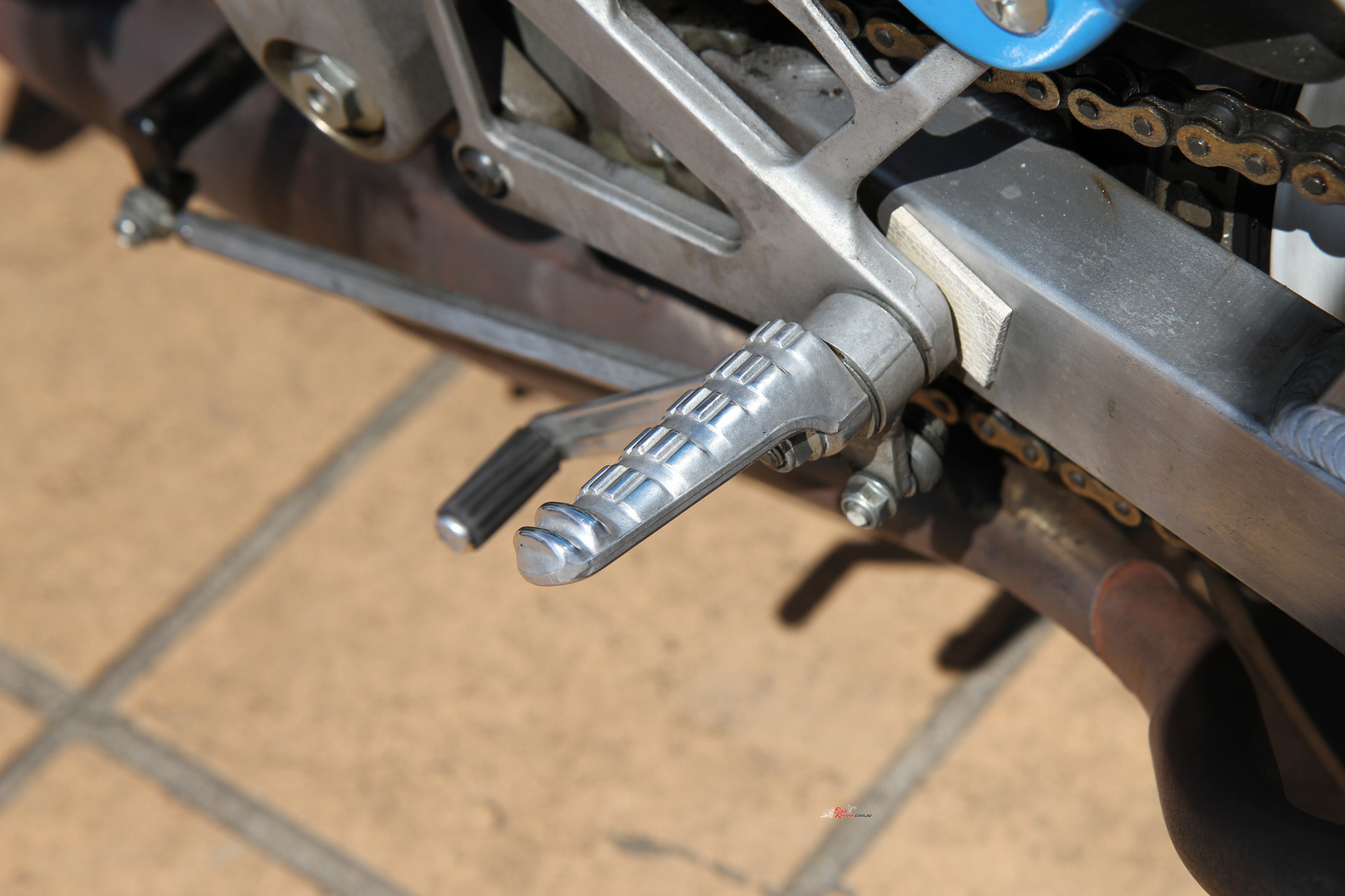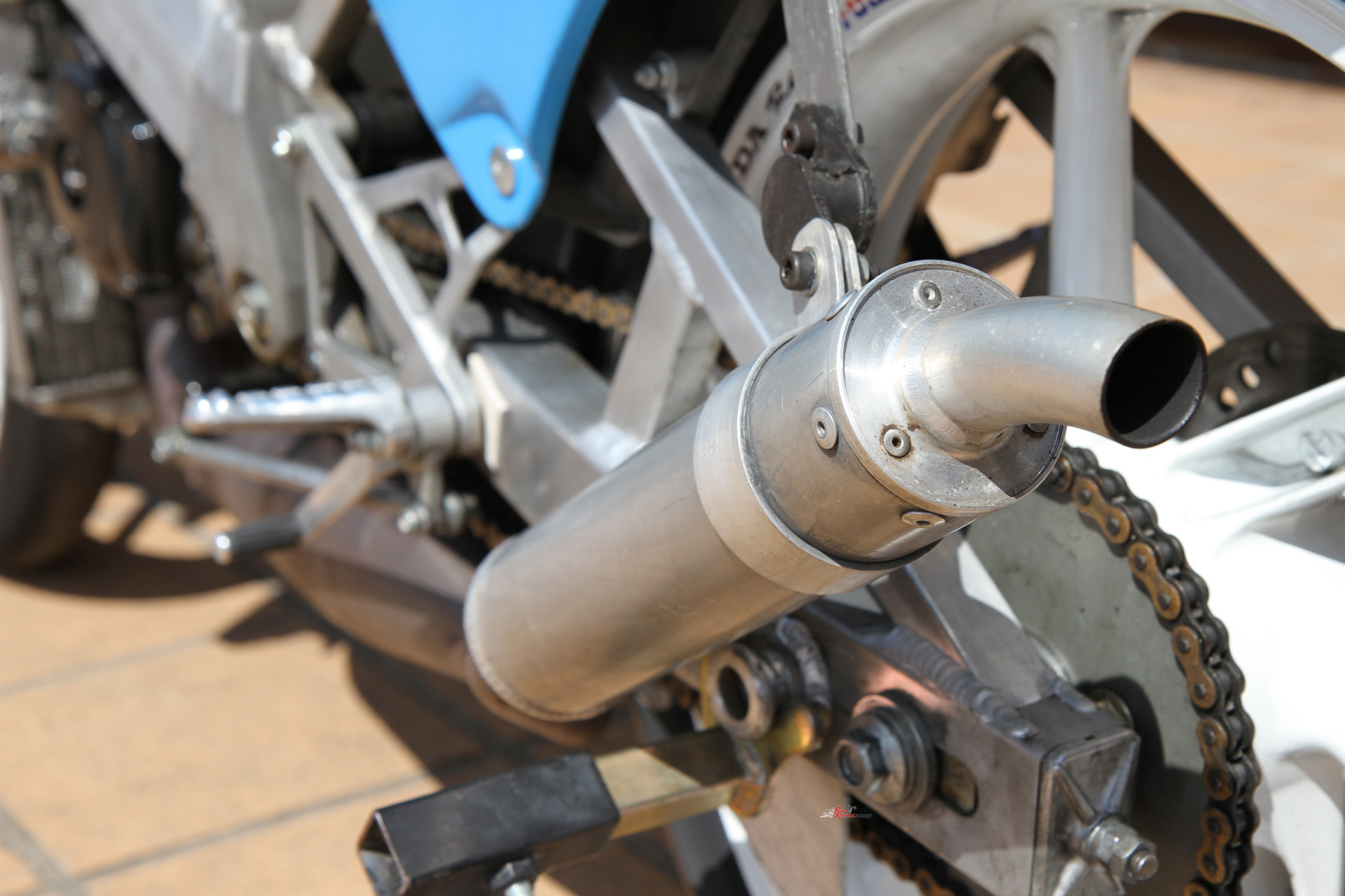Jack gave me a push start and the little two-stroke barked into life, fuelled by a Keihin carb belching Elf race juice. The clutch lever felt like it belonged on a BMX, the throttle snapped open with no resistance, and within seconds the RS125R was snarling down pit lane, eager to run.