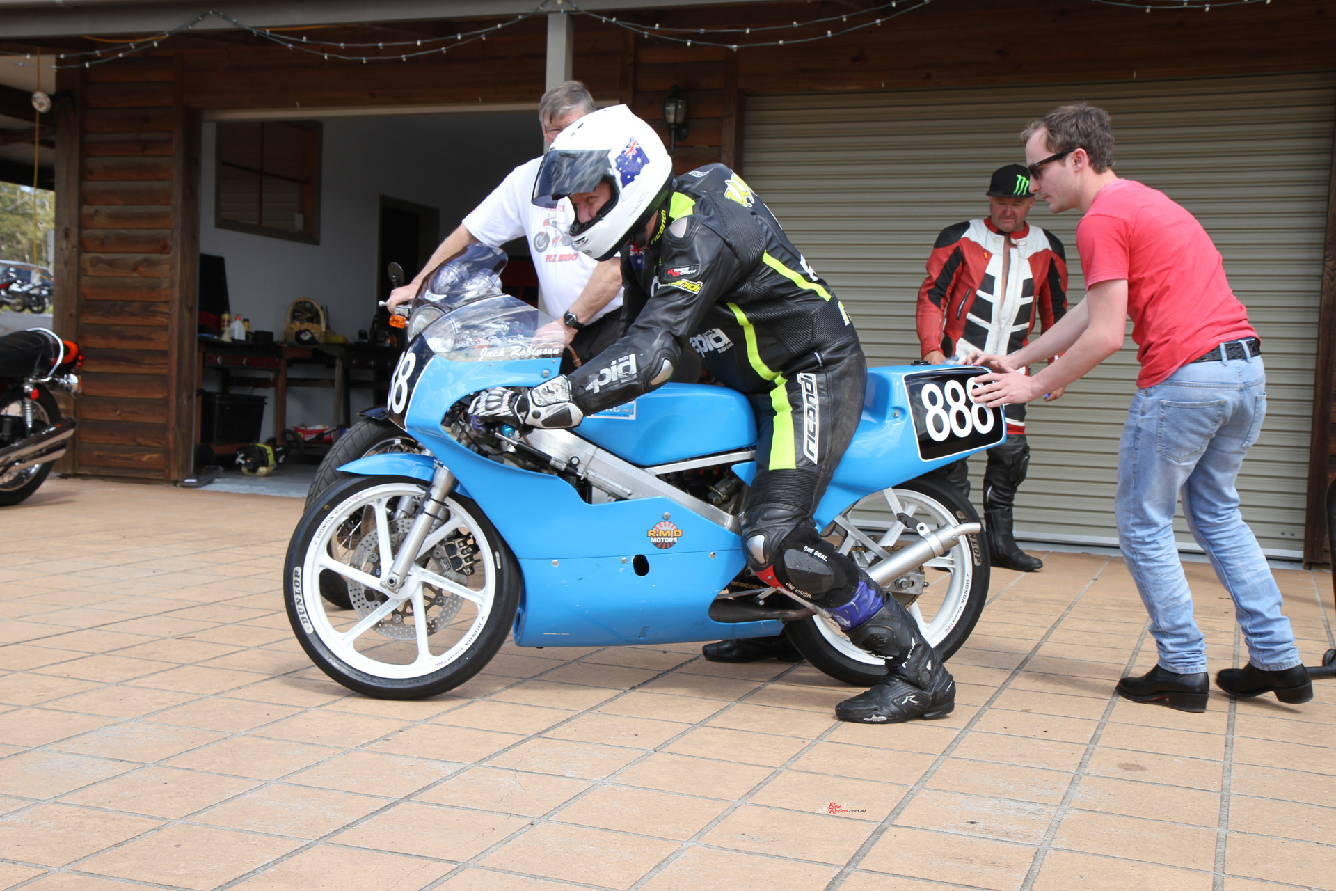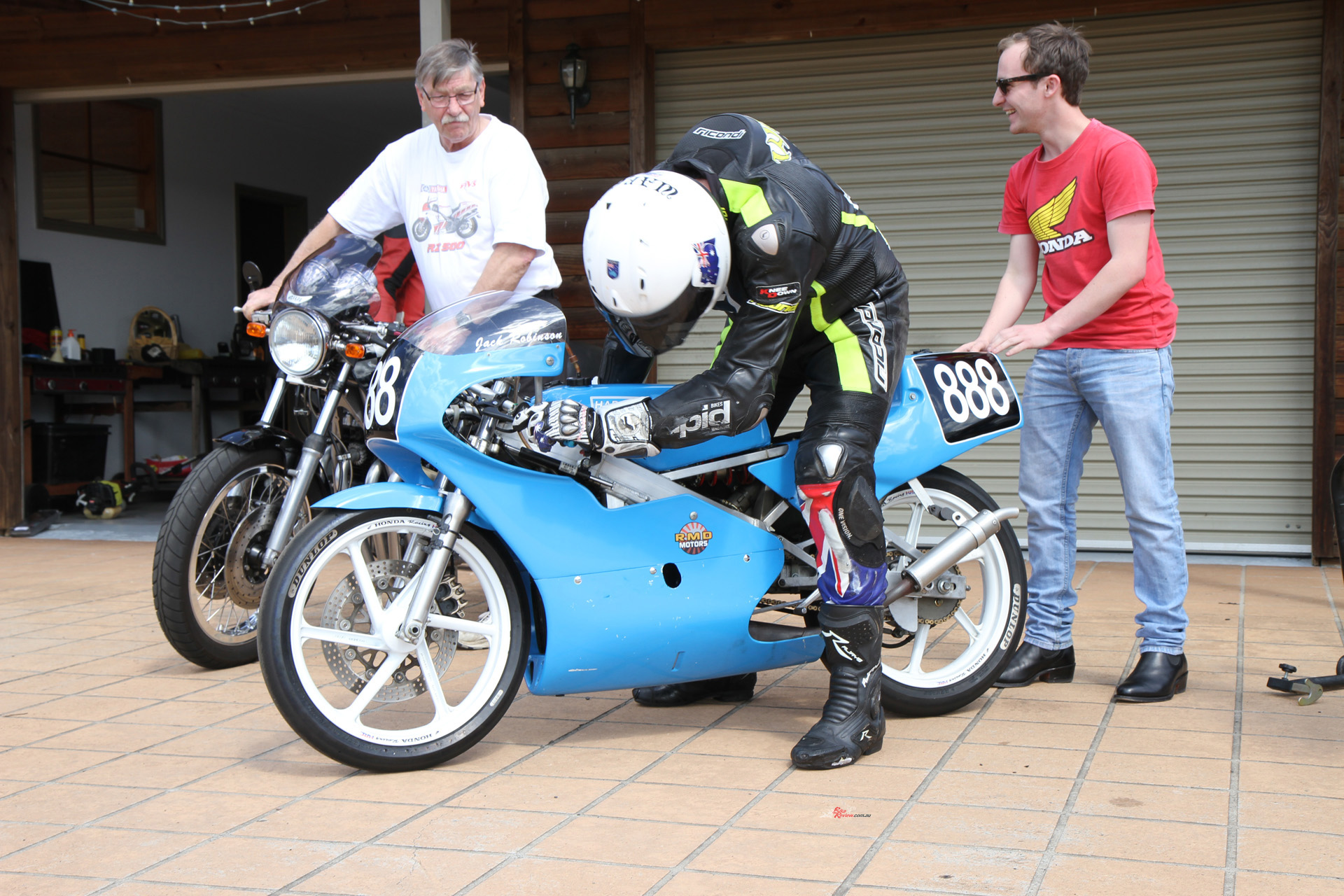 Dudley Lister (Left) watches Jack and Jeff start the bike. Dudley was Mick Doohan’s and Kevin Magee’s race engineer here among many other riders, and ran the Marlboro Yamaha Team here with Warren Willing, Glenn Willing and Jeff did part of his apprenticeship with Dudley in the 1990s at Willing Motorcycles.