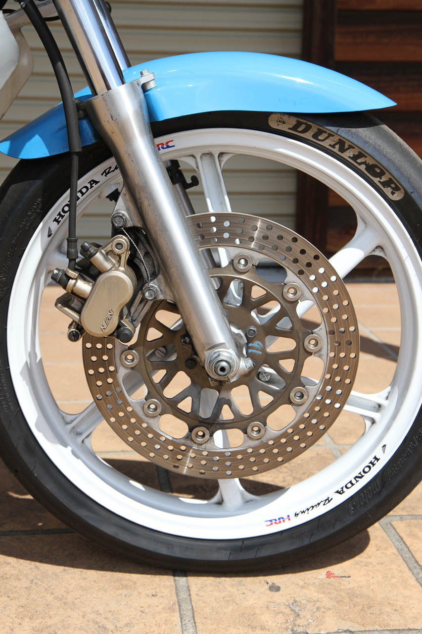 Chassis: Frame: Aluminium twin-tube, box-section swingarm, HRC steering damper, Nissin front and rear disc brakes, SHOWA forks and shock, 18-inch alloy wheels (1990) with Dunlop racing slicks, 1990/1992 model rear seat fairing.